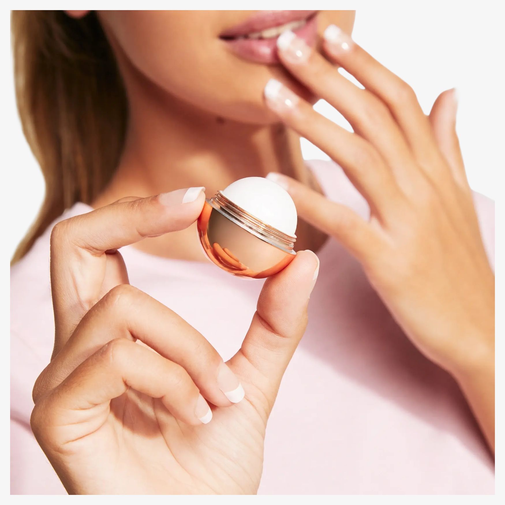El bálsamo labial Beiso está envasado en un estuche esférico con acabado cromado. El aroma a vainilla y la protección SPF15 son adecuados para el uso diario. Dimensión: 3,8 cm.