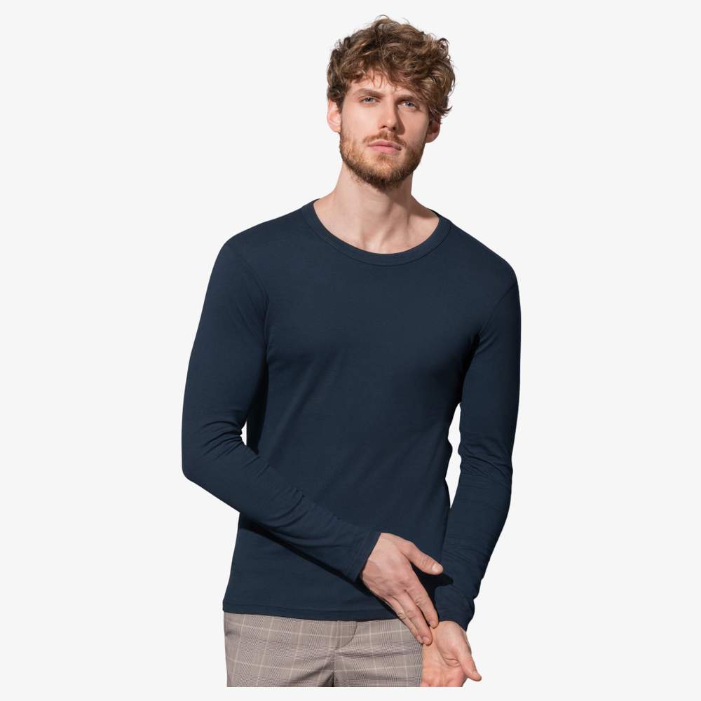 Camiseta de manga larga para hombre, corte ajustado, confeccionada en jersey de algodón simple robusto con cuello de punto. Este modelo presenta un corte ceñido al cuerpo y no tiene etiqueta de marca en el cuello. El cuello de punto está adornado con un borde. Las costuras laterales aseguran un confort óptimo. Una pequeña etiqueta de tamaño está discretamente colocada en el cuello, mientras que la etiqueta de cuidado está integrada en la costura lateral.