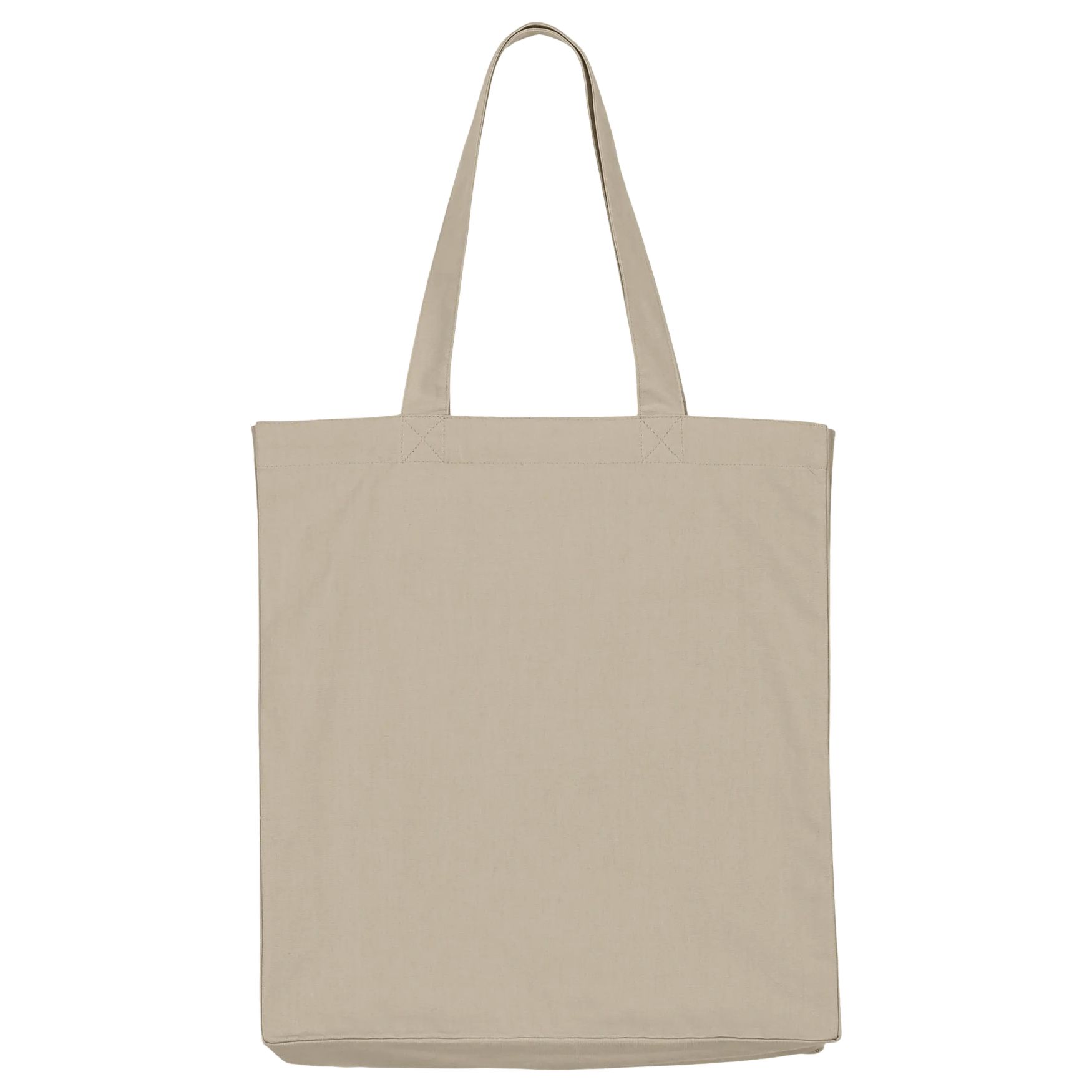 La bolsa tote está fabricada en 100 % algodón reciclado con acabado cardado y borde abierto. Cuenta con un dobladillo superior plegado y fuelle inferior en los laterales para mejor forma. Las asas largas están hechas con el mismo tejido y cosidas con puntada cruzada para mayor resistencia. Un bolsillo interior de algodón completa esta bolsa.