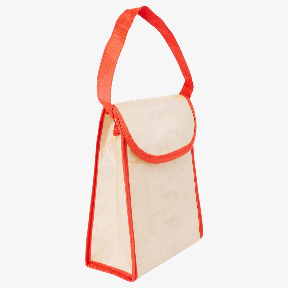 Bolsa térmica en papel laminado, con interior en aluminio térmico y aislante de espuma de 2 mm. Asa de 60 cm y solapa con cierre autoadhesivo. Refuerzos y asa del bolso en color a juego. Dimensiones: 20 x 10 x 25 cm.