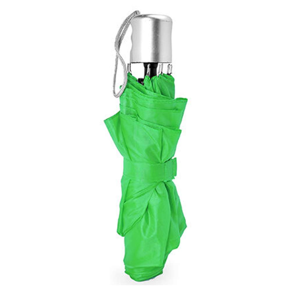 Paraguas plegable con funda a juego. Asa, varillas y punta plateadas. Cierre autoagripante y apertura manual. Dimensiones: 56 x 95 cm de diámetro.