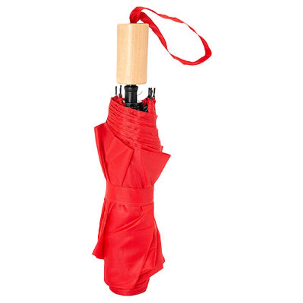 Paraguas plegable con funda a juego. Bastón, varillas y terminales negros. Asa de madera natural. Cierre auto-adhesivo a juego y apertura manual. Dimensiones: 56 x 95 cm. Composición: poliéster reciclado RPET, metal y madera.