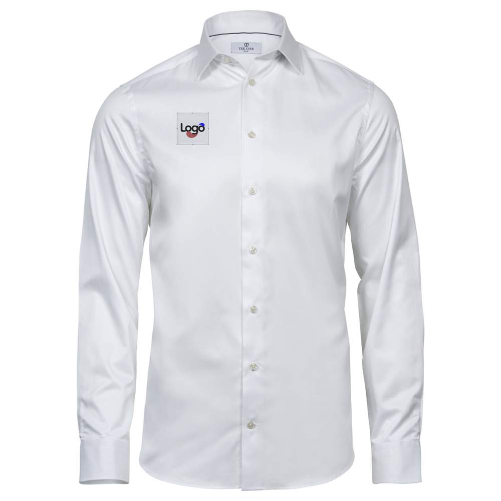 Camisa ajustada para hombre, diseñada en 100% algodón hilo teñido. Presenta un cuello italiano, un corte ajustado, un cuello y puños incorporados, un entallado en la espalda, pinzas en la espalda y un dobladillo redondeado. Fácil de cuidar, esta camisa ofrece un confort óptimo y un estilo elegante. La posibilidad de personalización en bordado permite agregar su logo o su diseño para una imagen de marca única.