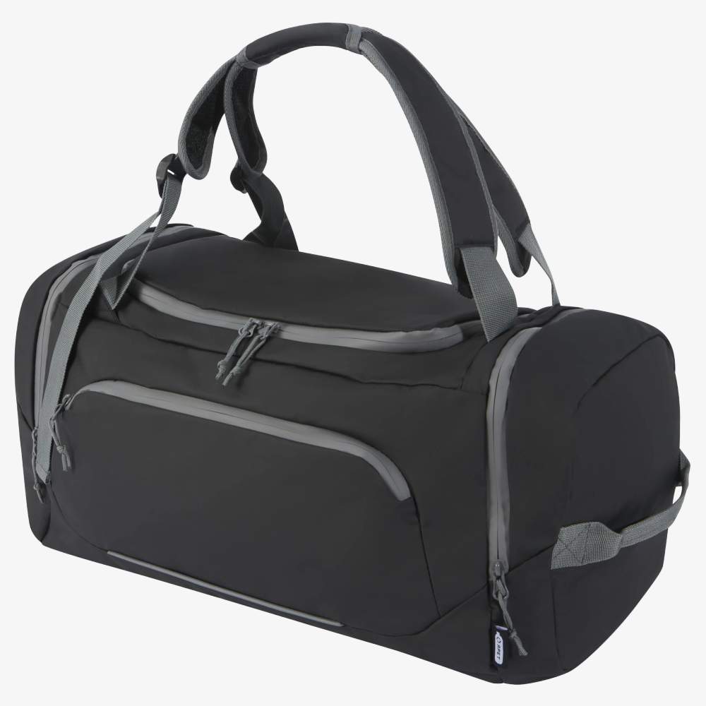 Mochila 2-en-1 resistente al agua fabricada con materiales reciclados, incluidas las cremalleras. Cuenta con un compartimento principal espacioso con una abertura en forma de U para un almacenamiento y acceso fáciles, dos bolsillos laterales con cremallera (incluyendo un compartimento para zapatos), un bolsillo frontal con cremallera, un bolsillo de malla para botella de agua en la parte posterior y un borde reflectante para mayor visibilidad. Esta mochila se puede transportar de 3 maneras diferentes: a mano, al hombro, o como mochila con sus correas acolchadas y ajustables. Los materiales reciclados incluyen el tejido principal, el forro, la correa y las cremalleras. Capacidad: 35 litros. Sin PVC. Dimensiones: 47 x 28 x 29 cm. Composición: poliéster reciclado