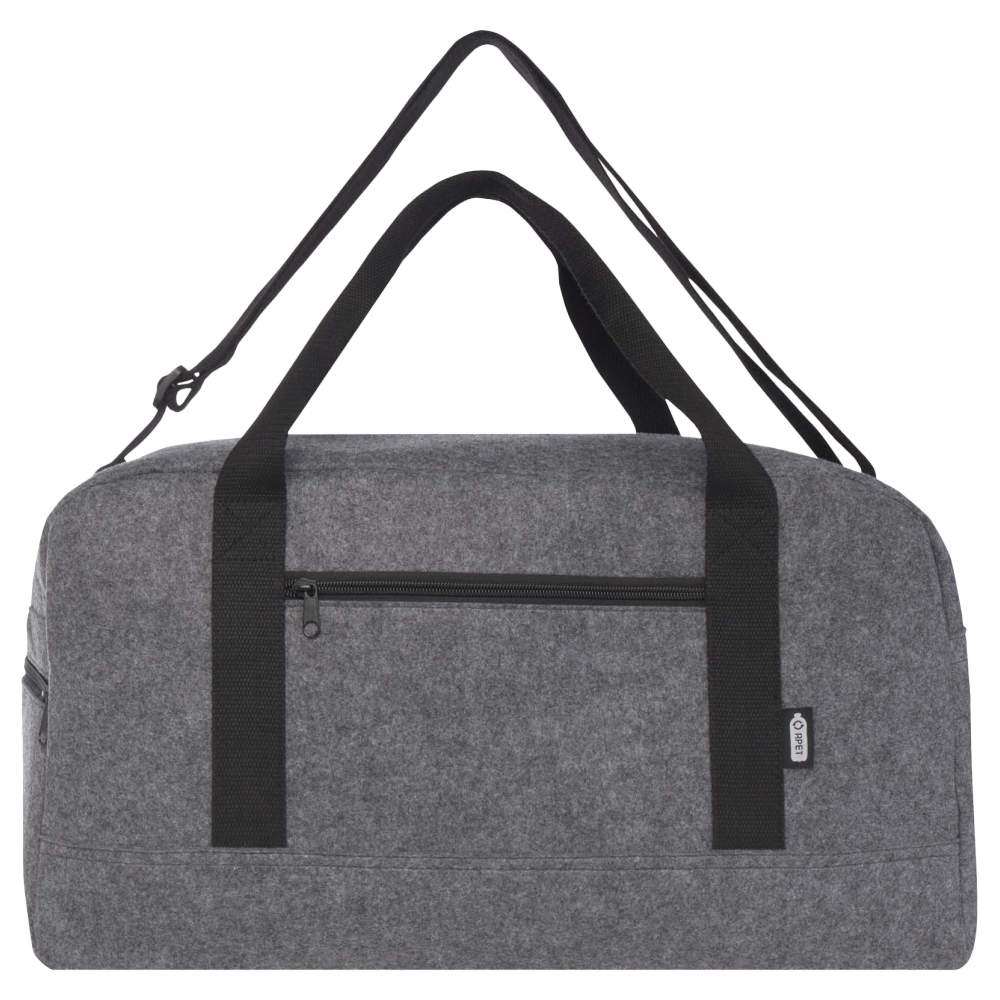 Bolsa de viaje diseñada en fieltro reciclado, ofreciendo una solución práctica para el transporte de objetos personales. Cuenta con un compartimento principal espacioso para guardar los efectos, así como un bolsillo frontal con cremallera y un bolsillo lateral para un acceso rápido a los objetos pequeños. Las correas desmontables y ajustables permiten un transporte cómodo sobre el hombro o en bandolera, mientras que las asas de algodón ofrecen una alternativa para un transporte a mano. Pequeños pies están presentes en la base de la bolsa para mantenerla ligeramente por encima del suelo.