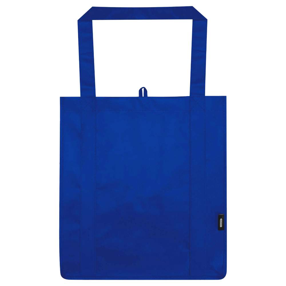Bolsa de compras liberty no tejido reciclado con base rígida de 29 litros. Fabricado en RPET no tejido duradero y resistente a la rotura, esta bolsa cuenta con una tabla de fondo para mayor solidez y versatilidad. Dispone de un gran compartimento principal y asas de 25 cm de largo. Capacidad de 29 litros y capacidad máxima de carga de 12 kg. Dimensiones: 33 x 25,4 x 36 cm. Composición: poliéster reciclado.