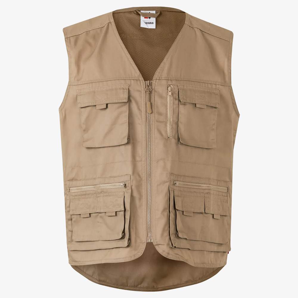 Chaleco de trabajo multipocket sin mangas. Cierre central con cremallera. Parches delanteros y traseros. Interior en lona. 9 bolsillos: 2 bolsillos de pecho con solapa, correderas y banda autoagripante, 1 bolsillo de pecho vertical con cremallera, 2 bolsillos delanteros con cremallera con solapa y 2 bolsillos más con solapa, correderas y banda autoagripante.