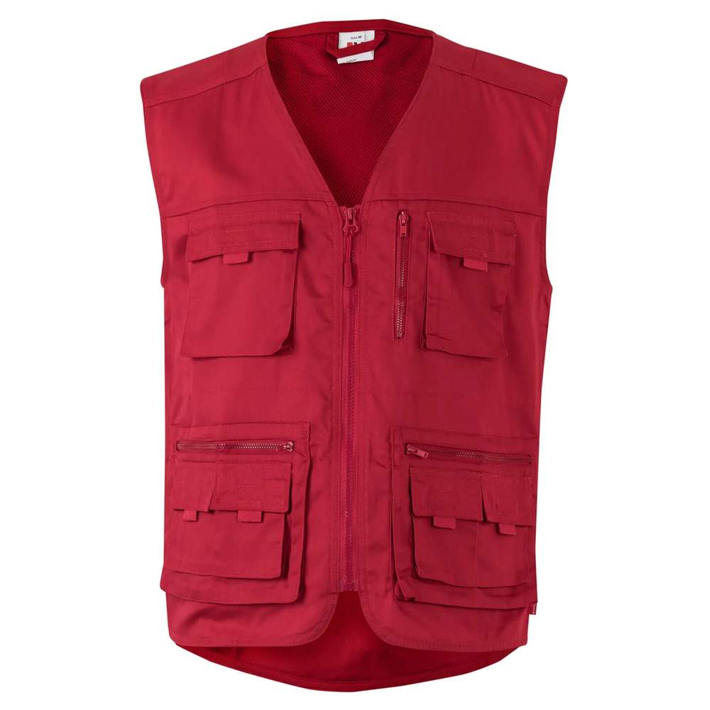 Chaleco de trabajo multipocket sin mangas. Cierre central con cremallera. Parches delanteros y traseros. Interior en lona. 9 bolsillos: 2 bolsillos de pecho con solapa, correderas y banda autoagripante, 1 bolsillo de pecho vertical con cremallera, 2 bolsillos delanteros con cremallera con solapa y 2 bolsillos más con solapa, correderas y banda autoagripante.