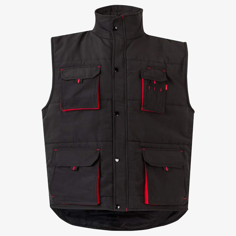 Chaqueta de trabajo sin mangas diseñada para ofrecer confort y funcionalidad. Cuenta con una cremallera central y bolsillos contrastados con solapas para mayor capacidad y acceso fácil. Las cintas contrastadas añaden un toque visual distintivo. Esta chaqueta está equipada con siete bolsillos prácticos: un bolsillo frontal con solapa, cinta y banda autoagripante, dos bolsillos delanteros con solapa, cinta y banda autoagripante, y dos bolsillos laterales debajo. Un bolsillo frontal adicional ofrece espacio de almacenamiento con solapa, banda autoagripante, cintas y compartimentos para bolígrafos. Un bolsillo interior permite guardar objetos personales de manera segura. Las solapas con botones de presión aseguran un cierre seguro. Los refuerzos cortavientos en las costuras ofrecen protección adicional contra los elementos. Composición: 100% microfibra de poliéster.