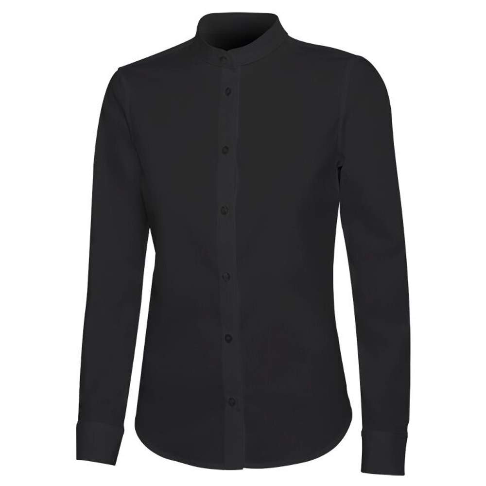 Camisa de mujer en algodón. Corte ajustado con pinzas delanteras y traseras para una silueta ajustada. Cuello mao. Cierre con botones y solapa. Panel en la espalda para mayor comodidad y sujeción. Muñecas con botones. Botón de repuesto incluido.