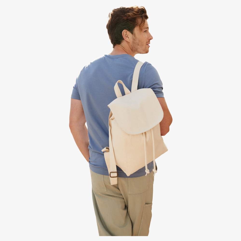 Mochila fabricada a partir de tela de algodón biológico resistente. Dispone de un cordón de cierre y una solapa con cierre de presión. Las correas son ajustables para un porte cómodo. También cuenta con un asa de transporte.
