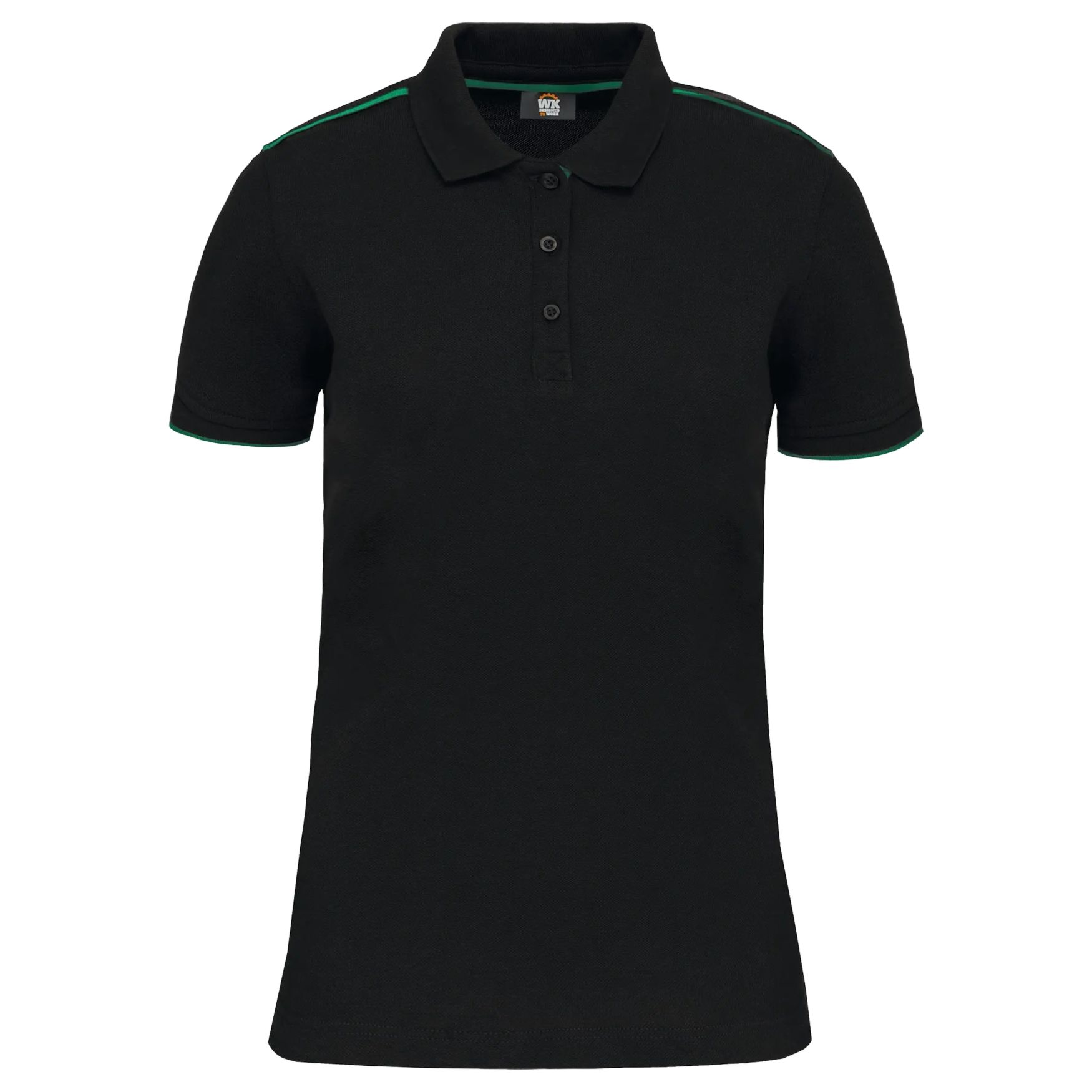 Polo con contraste manga corta para mujer. Solapa de tres botones con banda interior contrastada. Cuello en bord-côte con banda de propreté. Pasa hilos contrastado interior del cuello y los hombros. Terminaciones bord-côte con ribete contrastado al final de las mangas. Aberturas laterales con banda chevron contrastada para más confort. Terminación doble aguja al final de la prenda. Composición 65% poliéster, 35% algodón peinado malla picada.