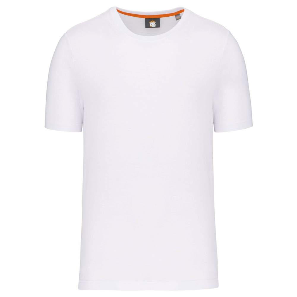 Camiseta ecológica para hombre. Corte recto y escote redondo con ribete 1x1. Banda de limpieza en chevron contrastada naranja en el escote (prolongación espalda-hombro excepto para el color blanco). Costura reforzada en los hombros. Terminación tubular y dobladillo bajo de las mangas. Etiqueta de marca tear-away desprendible para facilitar la personalización.