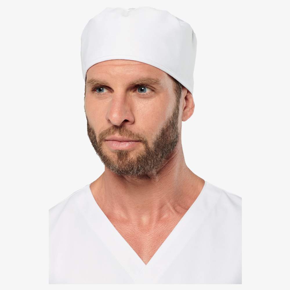 Sombrero bandana unisexo. Ajuste por correas en la parte trasera. Ranura de comodidad trasera. Parte frontal interior en esponja para un confort óptimo. Tela sergé. Norma ISO 15797. Composición : 65% poliéster, 35% algodón.