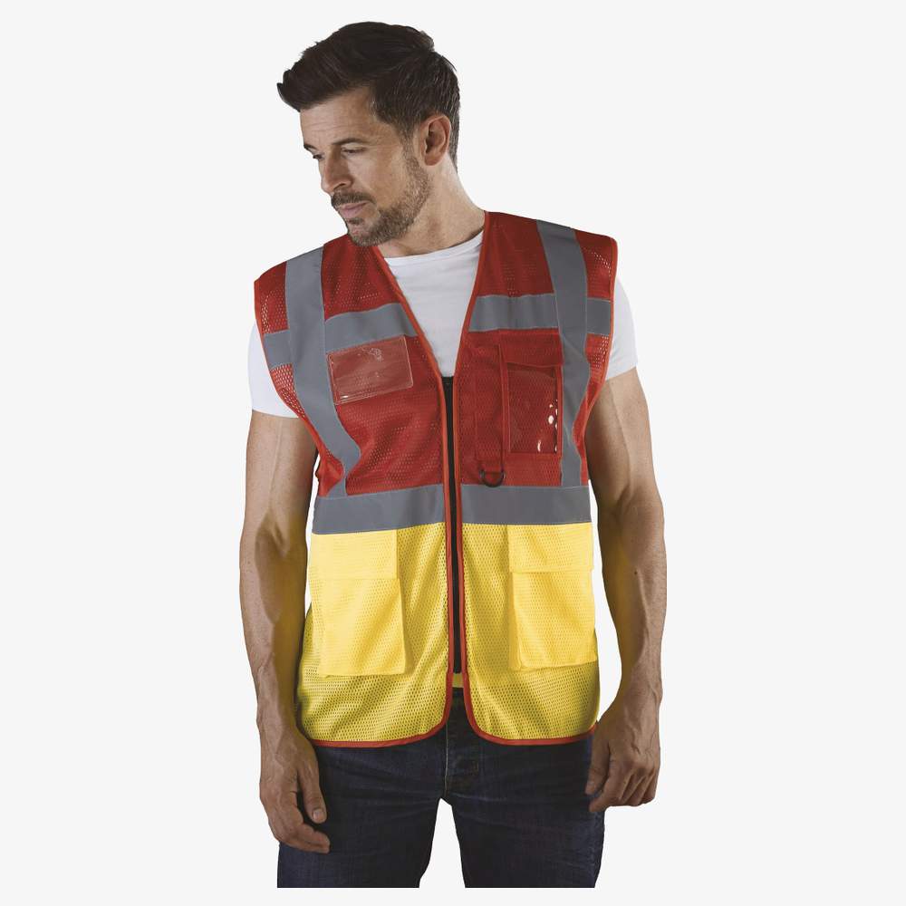 Este chaleco de alta visibilidad está diseñado para ofrecer comodidad y seguridad. Fabricado a partir de botellas de plástico PET recicladas, combina rendimiento y respeto por el medio ambiente. Su malla ligera y transpirable asegura una buena ventilación, mientras que la banda reflectante de 5 cm garantiza una visibilidad óptima. Está equipado con múltiples bolsillos prácticos, incluyendo un bolsillo para teléfono/radio portátil, dos bolsillos con doble acceso, bolsillos para bolígrafos y llaveros, así como un bolsillo transparente en el pecho para documento de identidad.
