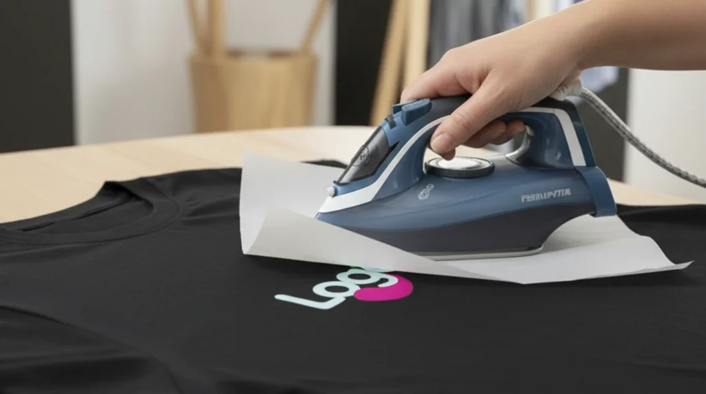 • Appliquez le fer quelques secondes, en exerçant une pression régulière et contrôlée. L’objectif est de réactiver la colle sans surchauffer le visuel.