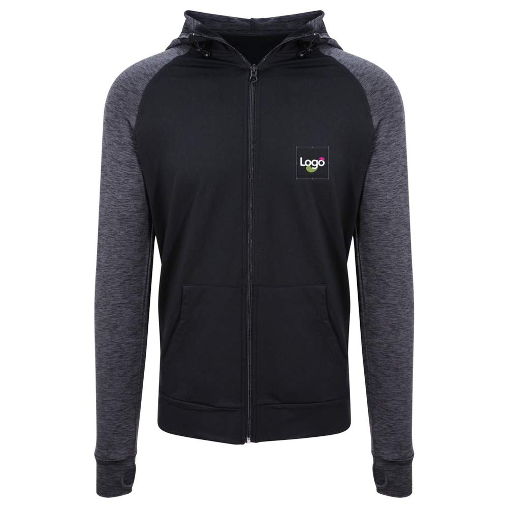 Lorsque les nuits deviennent fraîches ou si vous voulez enfiler un vêtement pour vous rendre à la salle de muscu, le sweat-shirt à capuche zippé Cool Sports allie des propriétés d'évacuation de l'humidité à du tissu légèrement gratté sur le corps. La capuche à cordon de serrage ajustable vous protège des éléments, tandis que les manches raglan et les passants de pouce vous procurent une grande liberté de mouvements. Manches et corps à tissu contrasté. Ce vêtement est personnalisable en broderie pour afficher votre logo ou votre visuel. Composition : corps - 89% polyester 11% élasthane ; contraste - 92% polyester 8% élasthane.