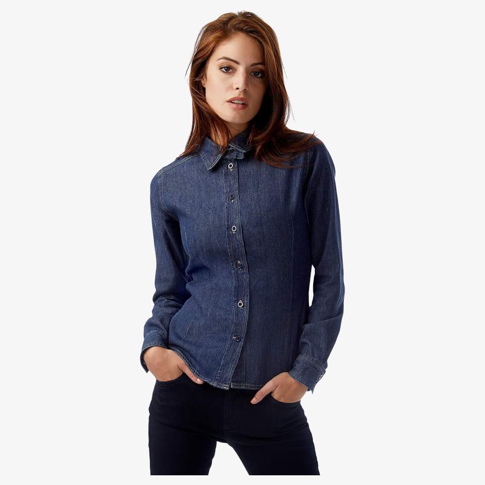Chemise manches longues pour femme en denim 100% coton à finition lavée. Pinces au niveau de la poitrine et du dos pour une silhouette féminine. Col féminin avec rabat supplémentaire et fine bande en denim retourné. Arrière du col en deux parties pour un look vintage. Boutons ton sur ton et plaquette de boutonnage en points zigzag. Bouton décoratif en laiton vieilli sur la patte de manche gauche. Empiècement décoratif muni de surpiqûres doubles à l'avant de l'épaule. Gousset en denim retourné sur le bord inférieur. Bord inférieur arrondi.