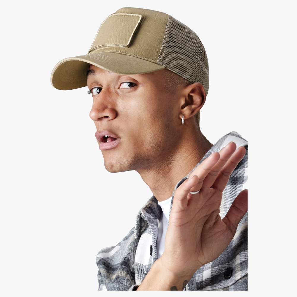 Casquette 5 panneaux design à visière précourbée et patch interchangeable à bande auto-agrippante conçu pour la décoration (environ 10x 6,5 cm). Taille unique ajustable via fermeture en matière plastique. Étiquette détachable.