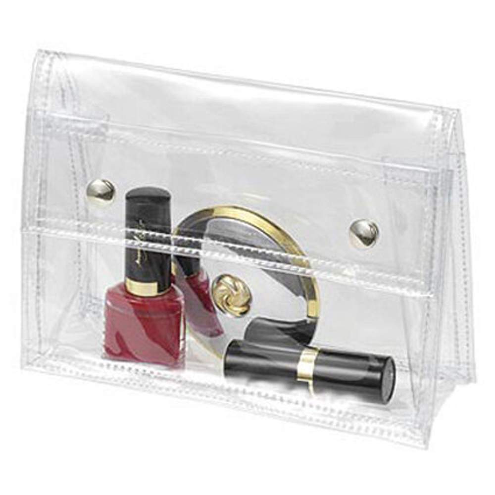 Trousse transparente conçue pour le rangement de produits cosmétiques et d'accessoires de toilette. Elle se distingue par sa conception pratique et sa fermeture sécurisée par un rabat doté de boutons pression. Ses dimensions permettent un rangement aisé dans une valise ou un sac de voyage. La transparence du matériau facilite l'identification du contenu.
