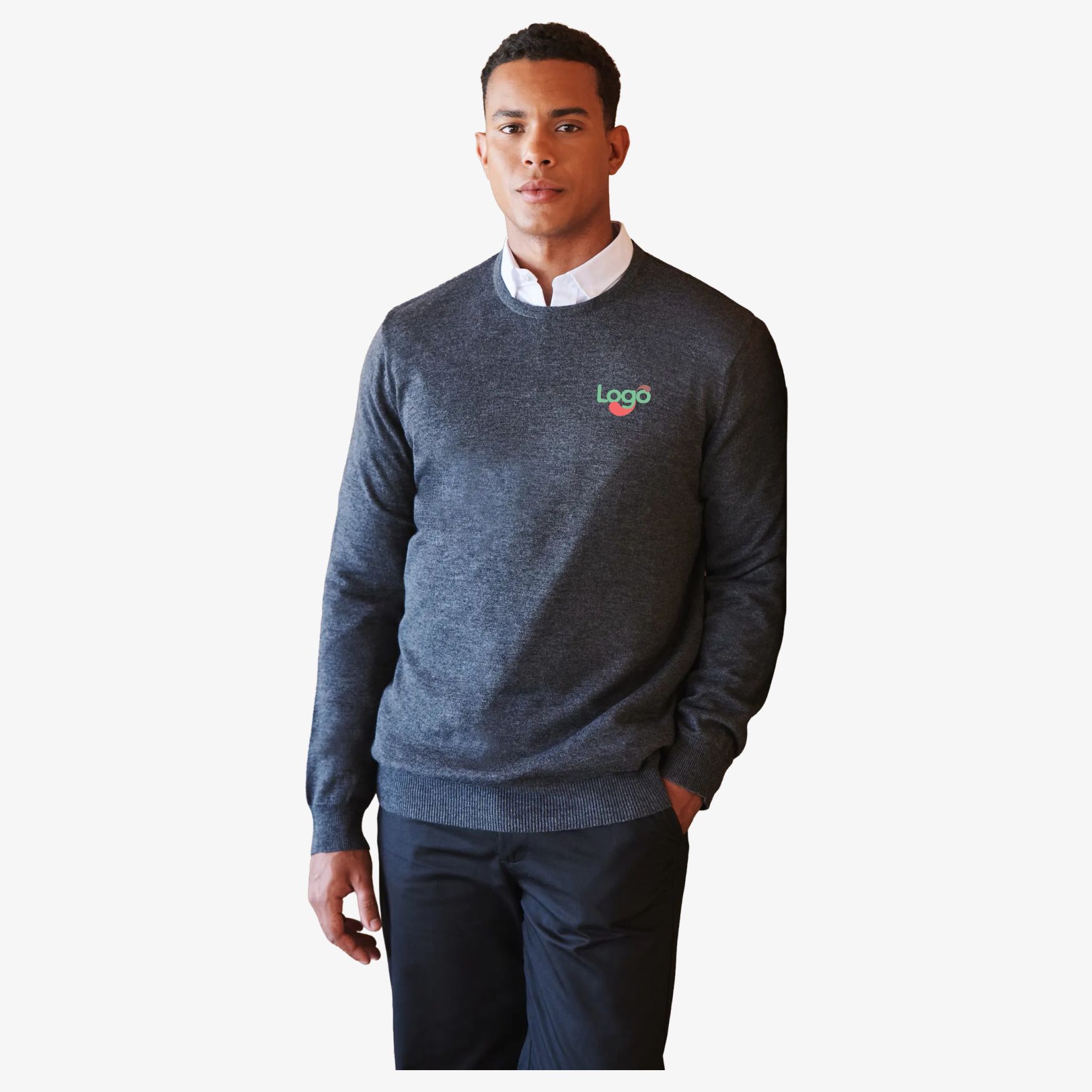 Le Men s crew neck Jumper est un pull col rond homme en maille tricotée jauge 12, avec bords côte 1x1 au col, aux emmanchures et à la taille. Composition : 50 % coton, 50 % acrylique. Personnalisable.
