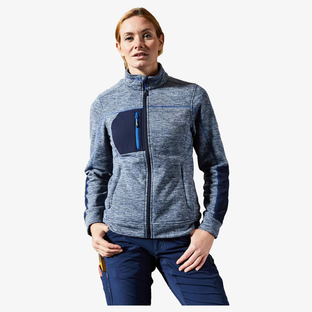 Veste pour femme, légèrement cintrée, en polaire tricotée facile d'entretien pour le travail et les loisirs. Tissu doux, chaud et facile d'entretien, d'aspect chiné. Extérieur d'aspect lisse et texturé, intérieur souple, pelucheux et brossé. Possède deux poches latérales avec fermeture zippée dissimulée, deux poches intérieures, une poche poitrine en tissu tissé avec fermeture zippée contrastée. Coutures contrastées. Col montant. Fermeture zippée dissimulée sur toute la longueur avec protection du menton.