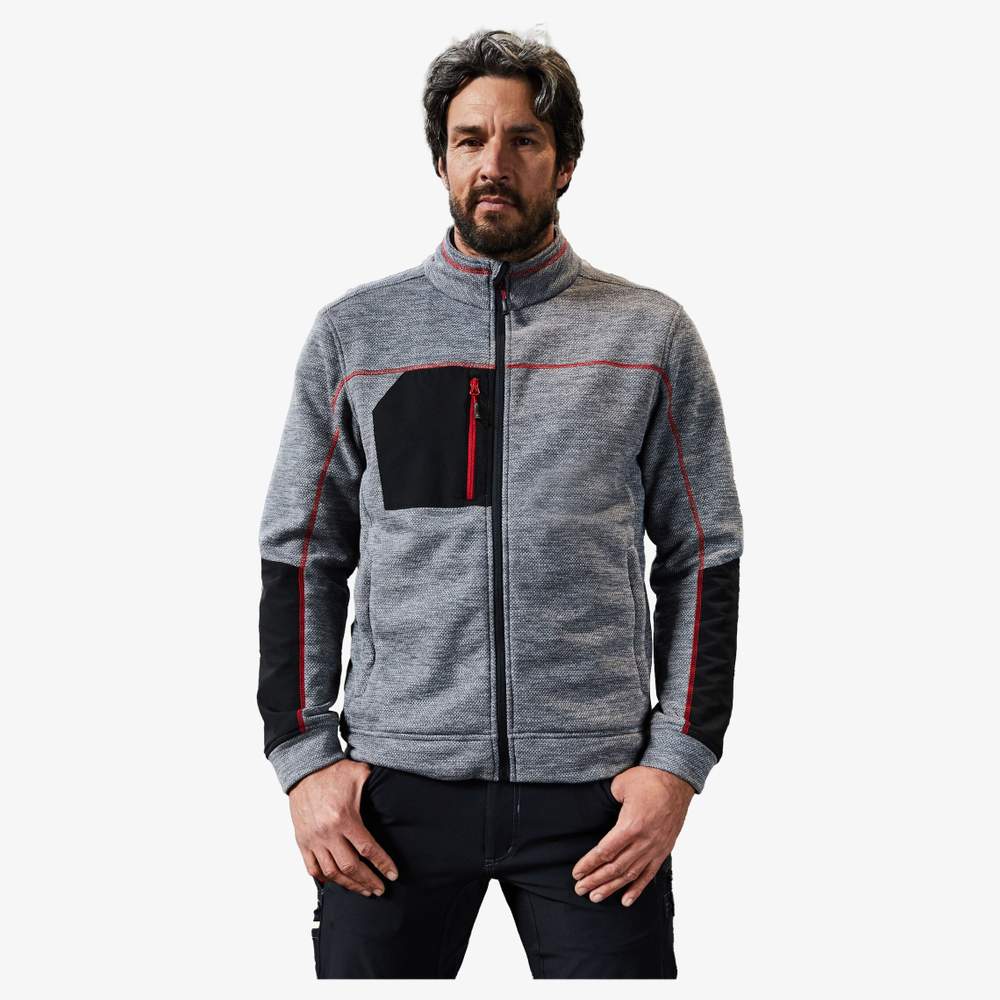 Veste en polaire tricotée facile d'entretien pour le travail et les loisirs. Tissu doux, chaud et facile d'entretien, d'aspect chiné. Extérieur d'aspect lisse et texturé, intérieur souple, pelucheux et brossé. Possède deux poches latérales avec fermeture zippée dissimulée, deux poches intérieures, une poche poitrine en tissu tissé avec fermeture zippée contrastée. Coutures contrastées. Col montant. Fermeture zippée dissimulée sur toute la longueur avec protection du menton. Composition : 100% polyester dont 80% recyclé.