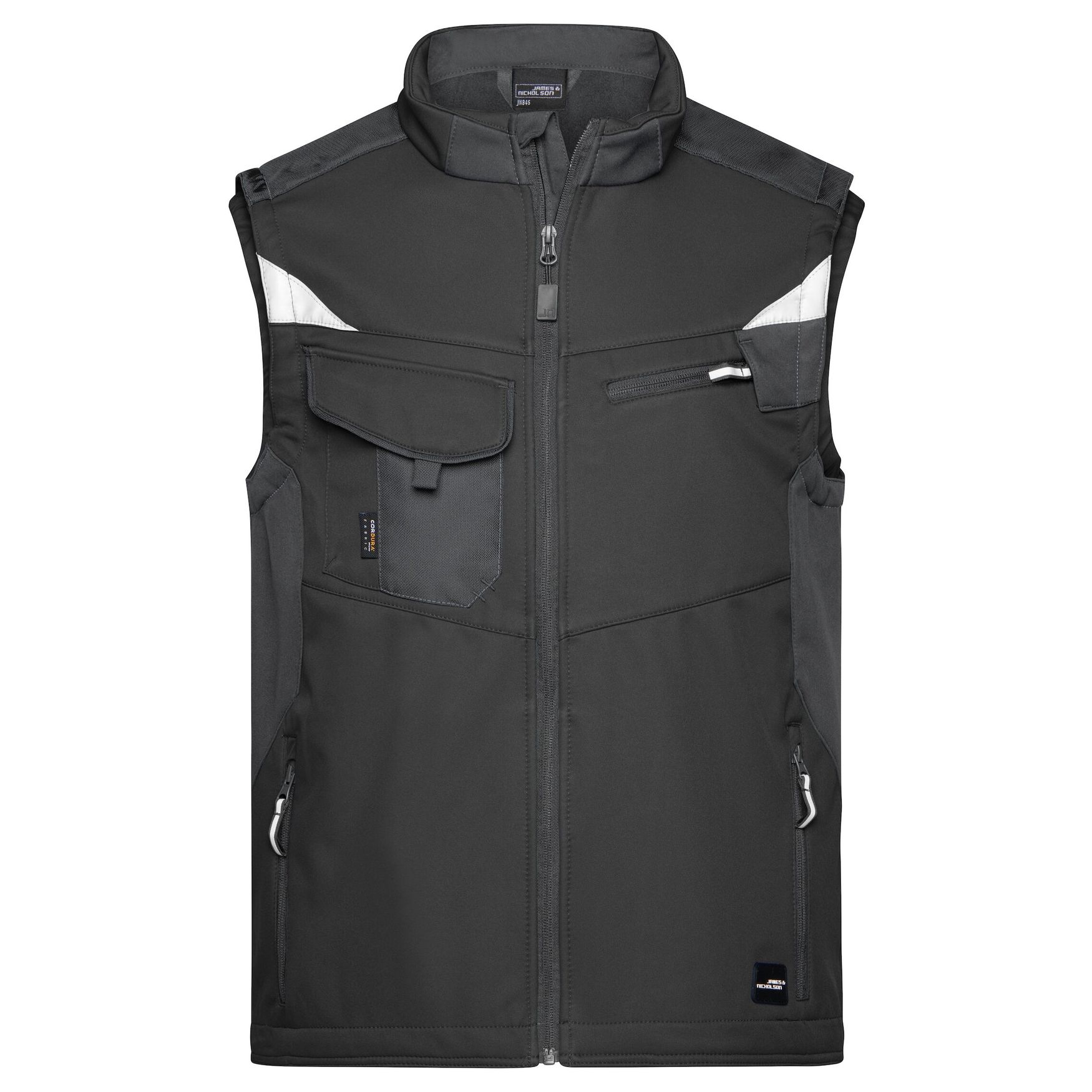 Gilet softshell professionnel sans manches, de haute qualité en matériau softshell robuste et durable. Coupe-vent et hydrofuge (colonne d'eau de 2 000 mm), à propriété respirante et perméable à la vapeur d'eau (2000 g/m² /24h). Col montant, poignets élastiques. Zone des épaules renforcée par CORDURA®. Fermeture zippée couverte sur toute la longueur avec protection contre le vent. Possède de nombreuses poches : poches latérales; sur la poitrine avec fermeture zippée; poche poitrine avec rabat; poches intérieures. Éléments réfléchissants (sans fonction de protection/pas d'EPI) sur les emmanchures et le dos. Composition : 100% polyester. Ce gilet softshell est personnalisable pour afficher votre logo ou votre visuel.