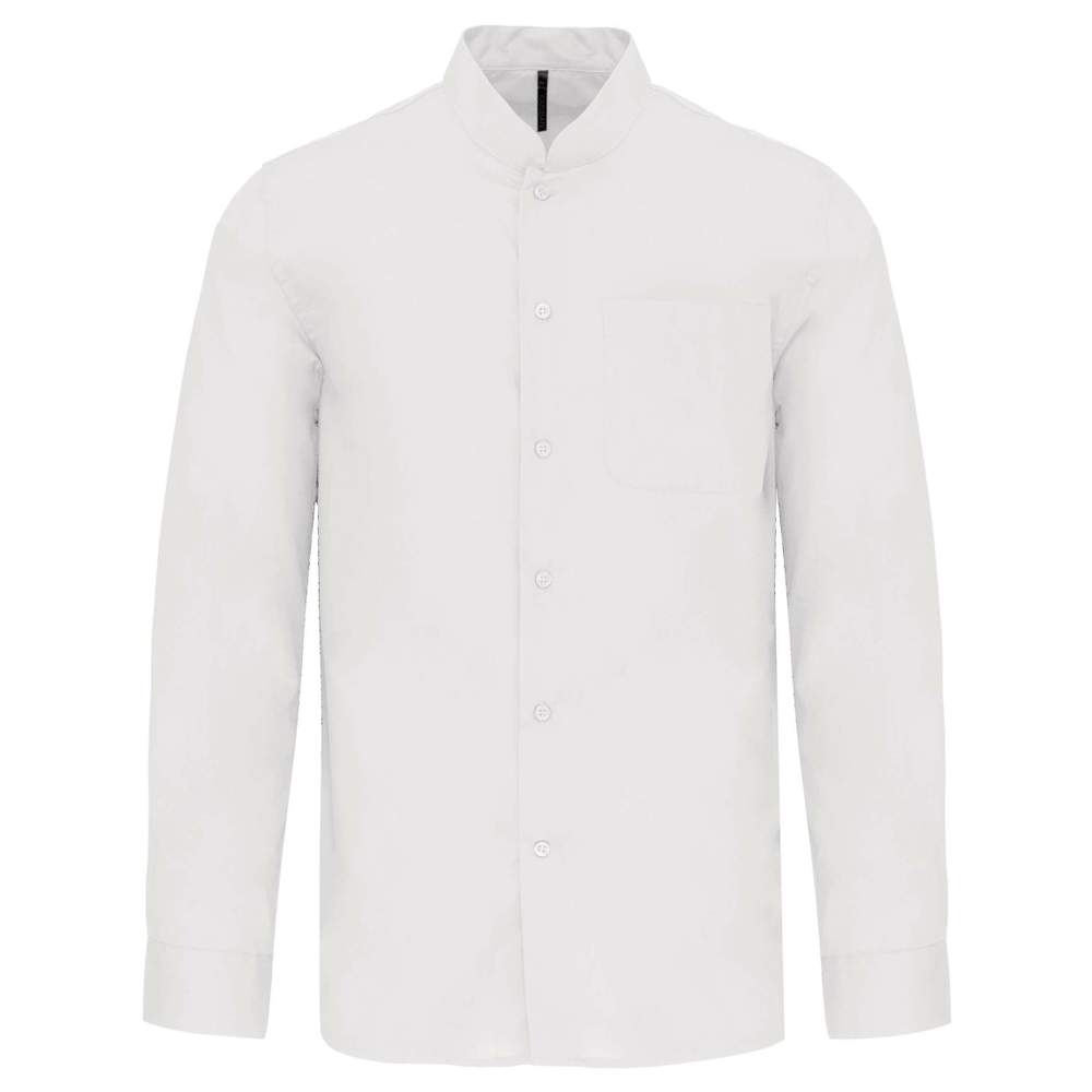 Cette chemise col mao manches longues est confectionnée en 65% polyester et 35% coton popeline pour un entretien facile. Elle présente un col mao non boutonné, des boutons ton sur ton et une poche poitrine sur le côté gauche, à angle arrondi. Le poignet est ajustable avec une patte capucin et dispose de 2 boutons de rappel.