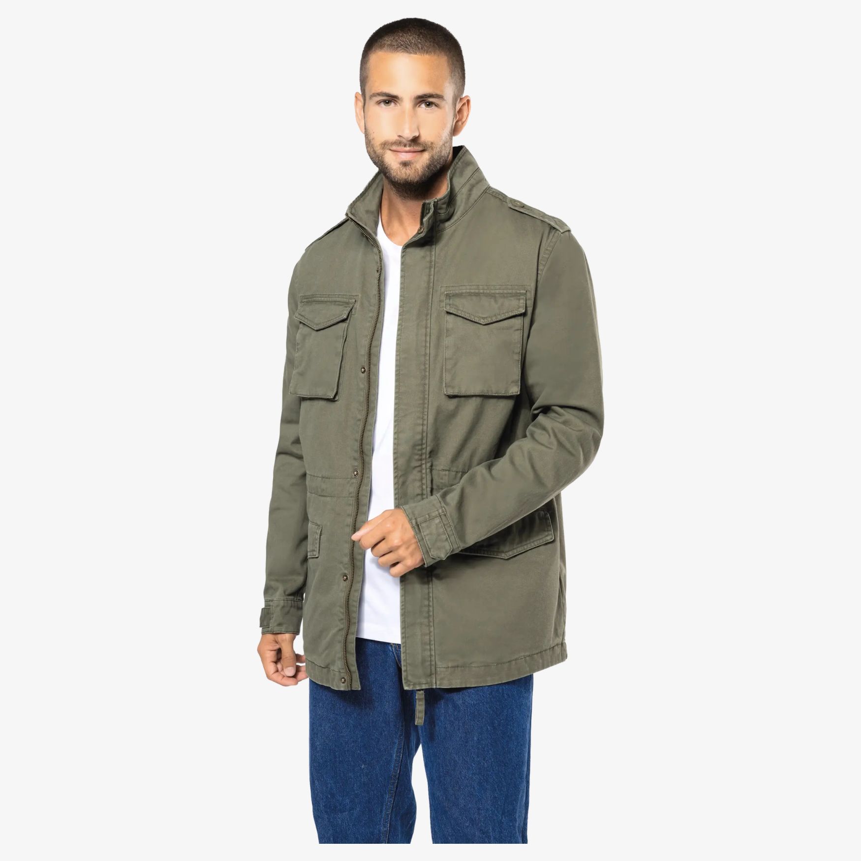 La veste safari homme en twill 100% coton, coupe droite, avec fermeture zippée et patte à boutons pression invisibles. Quatre poches extérieures à pression, une poche intérieure et un cordon de serrage ajustable à la taille. Finition intérieure avec parmenture et demi-lune intérieure pour la personnalisation.