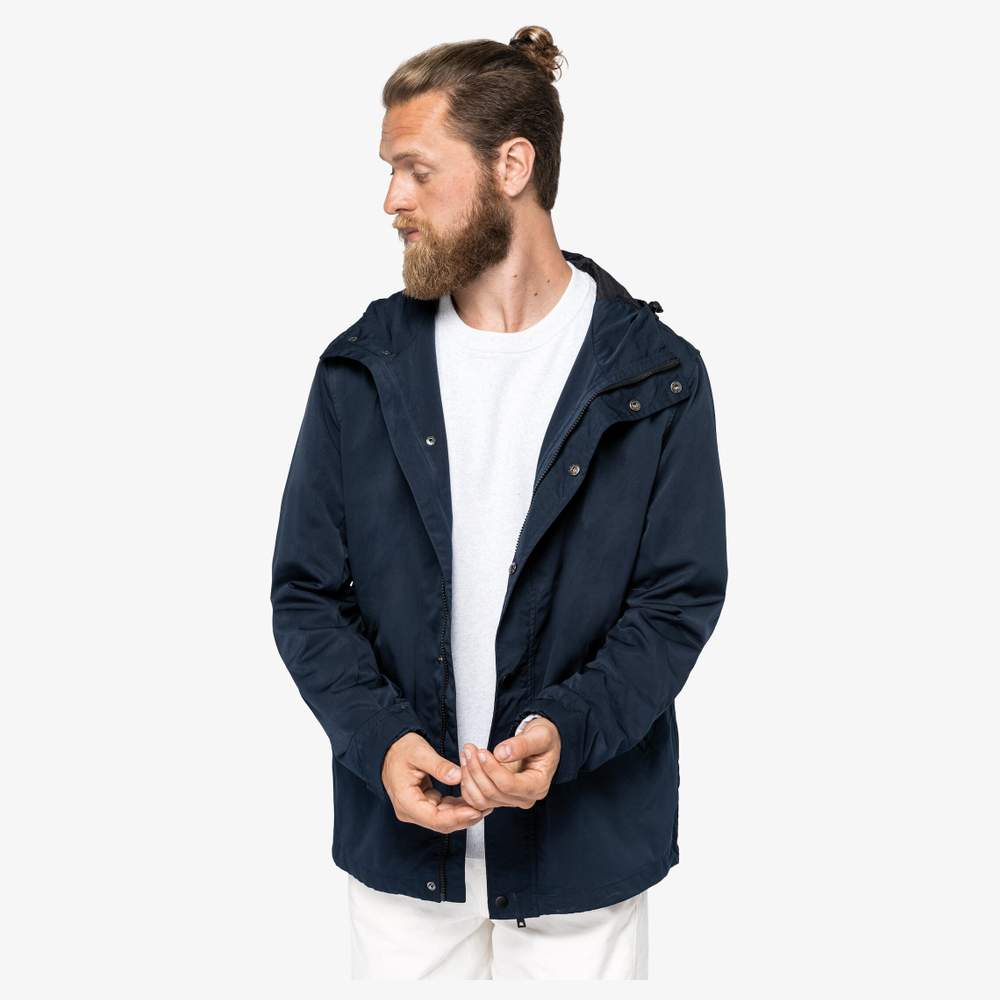 Veste écoresponsable à capuche unisexe. Boutons pression electrostatic paint et métal. Tissu déperlant. Zips en plastique et puller en métal. Poches latérales côtés à zips retournés (waterproof). Capuche panneaux, doublée en polyamide ripstop quadrillé. Bande auto-agrippante aux bas de manches + demi-élastique. Doublure intérieure en ripstop volante au dos pour faciliter la personnalisation. Finition biais à l'emmanchure, côtés vêtement et intérieur de manches. Œillet d'aération dos sous les manches. Élastique bas de vêtement, cordon de serrage avec stopper sur les côtés. Patte de boutonnage avec boutons pressions sur le milieu devant. Composition : 87% polyester (35% recyclé), 13% polyamide.