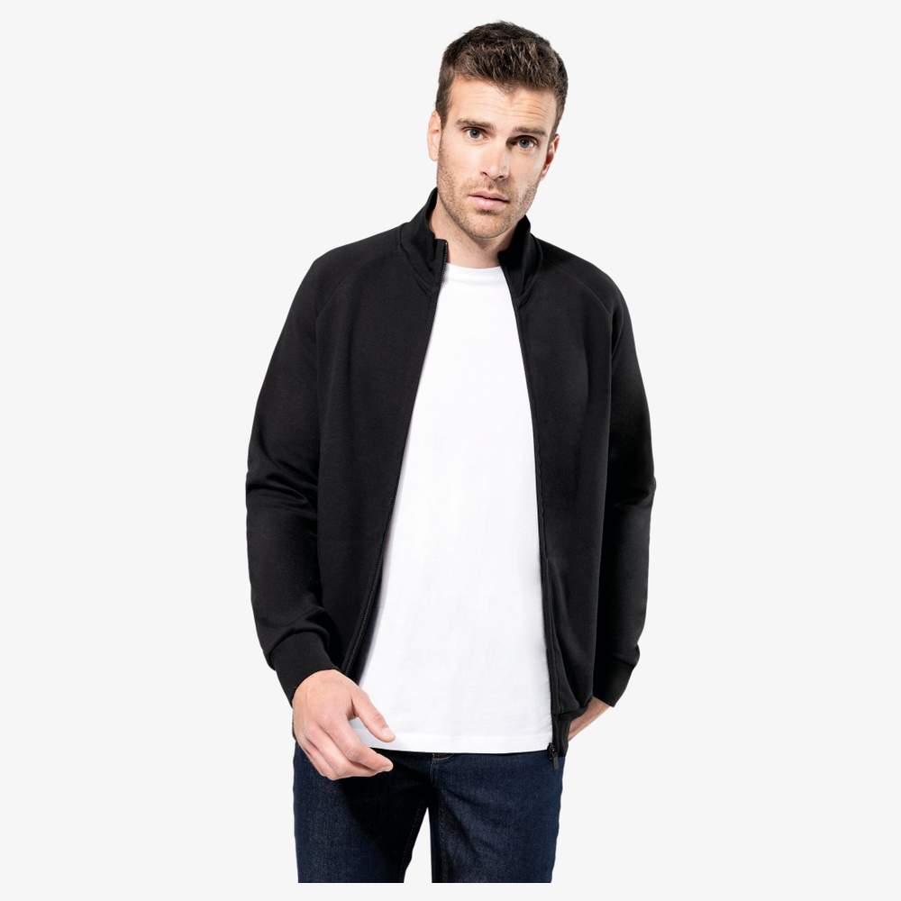 Veste zippée pour homme, conçue en coton peigné pour un confort optimal. Le tissu interlock assure une bonne tenue et un aspect soigné. Un traitement LSI (Low Shrinkage Interlock) est appliqué pour limiter le rétrécissement après lavage. La veste présente des surpiqûres au col et une bande de propreté sur l'encolure intérieure pour renforcer la durabilité et le confort. Elle est dotée d'un zip en nylon ton sur ton avec un zipper en métal et une finition de bande de propreté à l'intérieur. Les manches raglan offrent une plus grande liberté de mouvement. Des côtes 1x1 sont présentes aux poignets et à la base de la veste. Deux poches sont intégrées dans la couture de l'empiècement. La veste ne comporte pas d'étiquette de marque visible, mais est équipée d'une puce de taille pour faciliter l'identification.