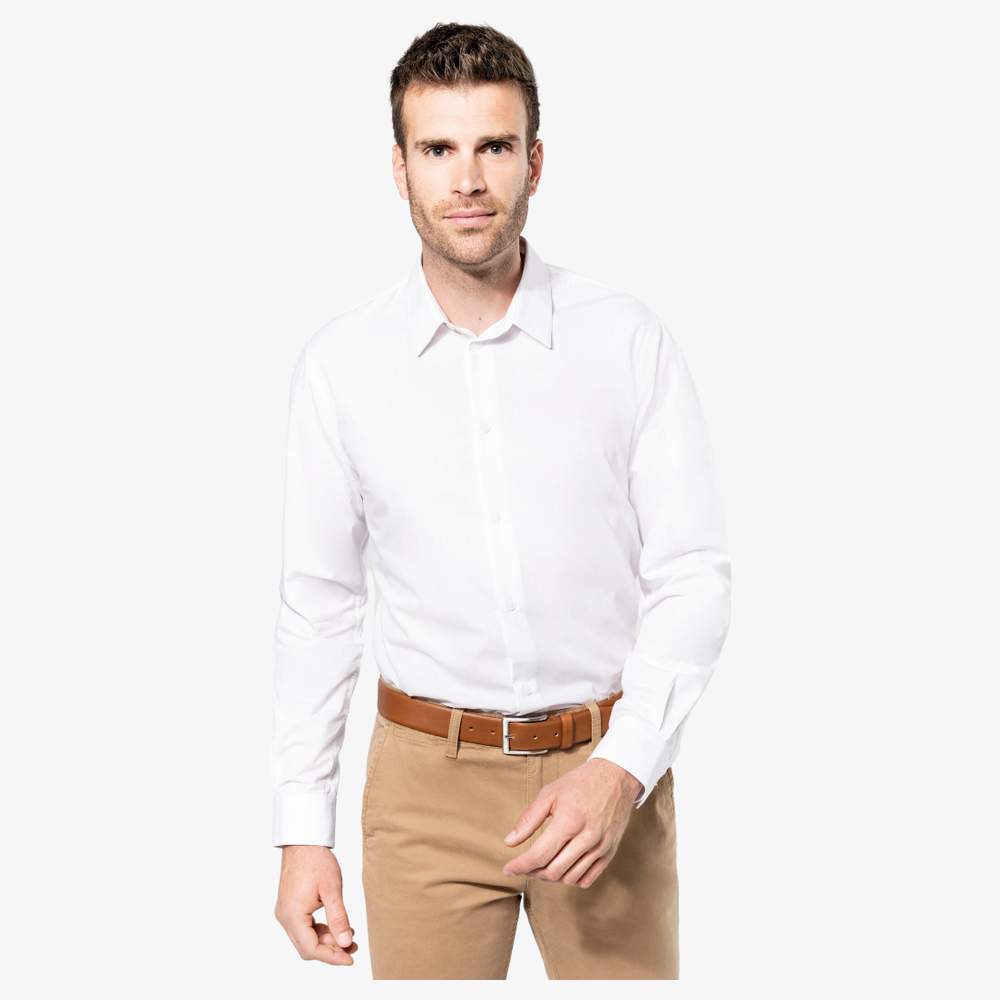 Chemise à manches longues pour homme, confectionnée en popeline de coton biologique. Elle présente un col français avec baleines amovibles et une patte de boutonnage classique avec des boutons en nacre. Un empiècement est présent au niveau du dos pour plus de confort. Les poignets sont droits et équipés de deux boutons. Des hirondelles sont intégrées sur les côtés pour une meilleure mobilité et un tombé plus fluide. L'absence d'étiquette de marque visible est privilégiée, seule une étiquette de taille est présente.