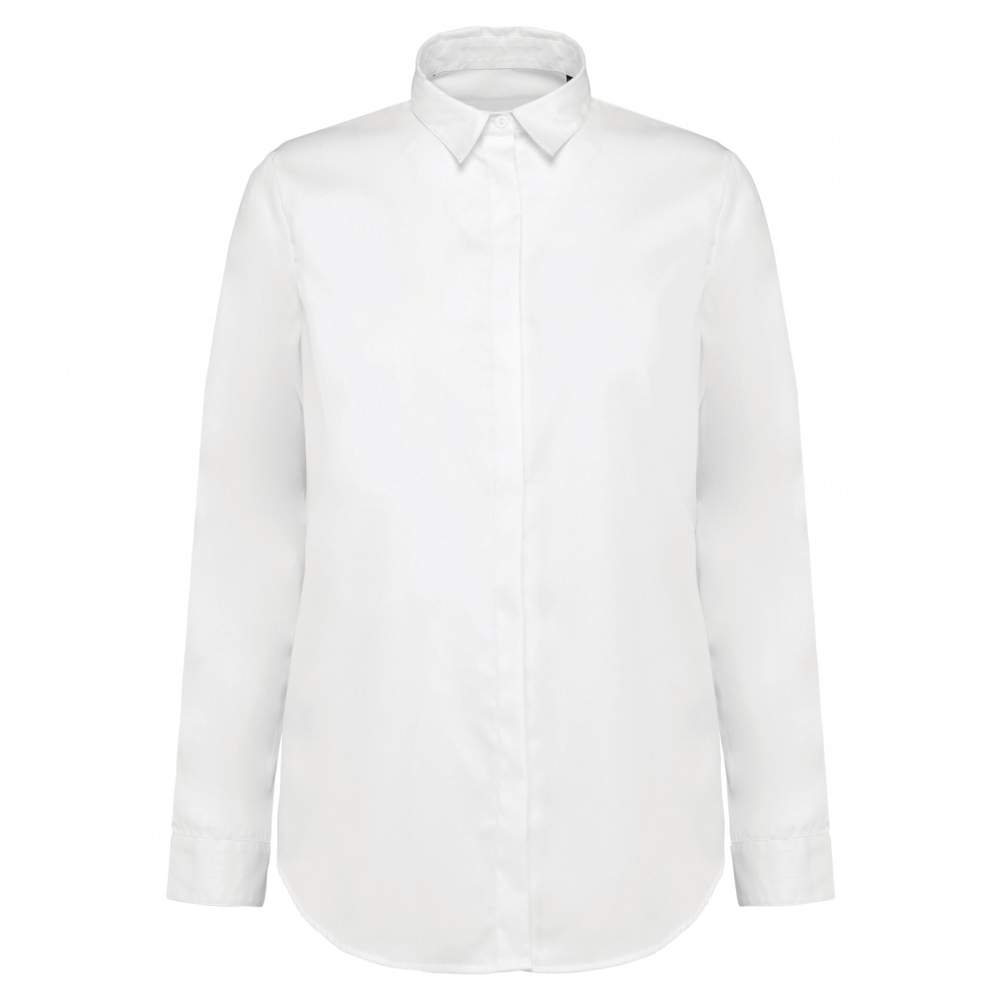 Chemise à manches longues pour femme, confectionnée en tissu twill 100% coton. Elle offre un confort optimal et une bonne résistance. Son traitement Easy care facilite l'entretien. Elle présente un empiècement haut du dos et une patte de boutonnage invisible. Les boutons sont en nacre et les poignées comportent 2 boutons à angles arrondis. L'absence d'étiquette de marque est compensée par une étiquette de taille discrète.