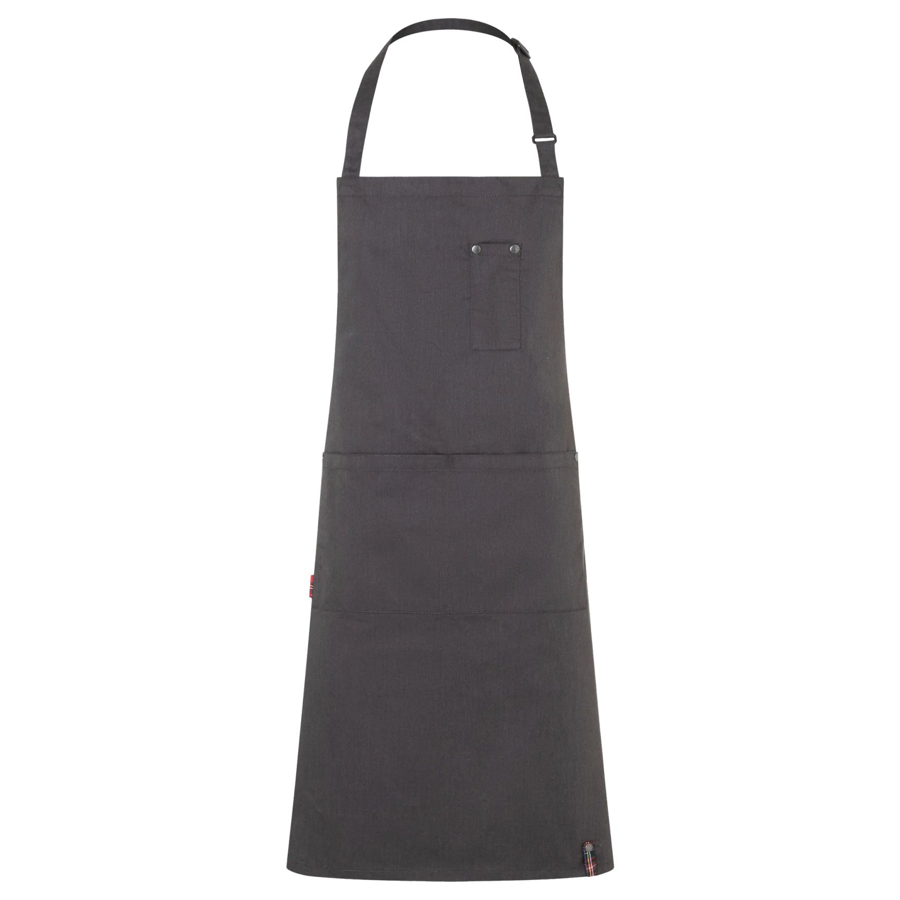 Le tablier à bavette denim-style est conçu en polyester recyclé et coton, combinant robustesse et confort. Il comporte deux grandes poches avant et une poche poitrine. La sangle est réglable grâce à une boucle pour un ajustement adapté.