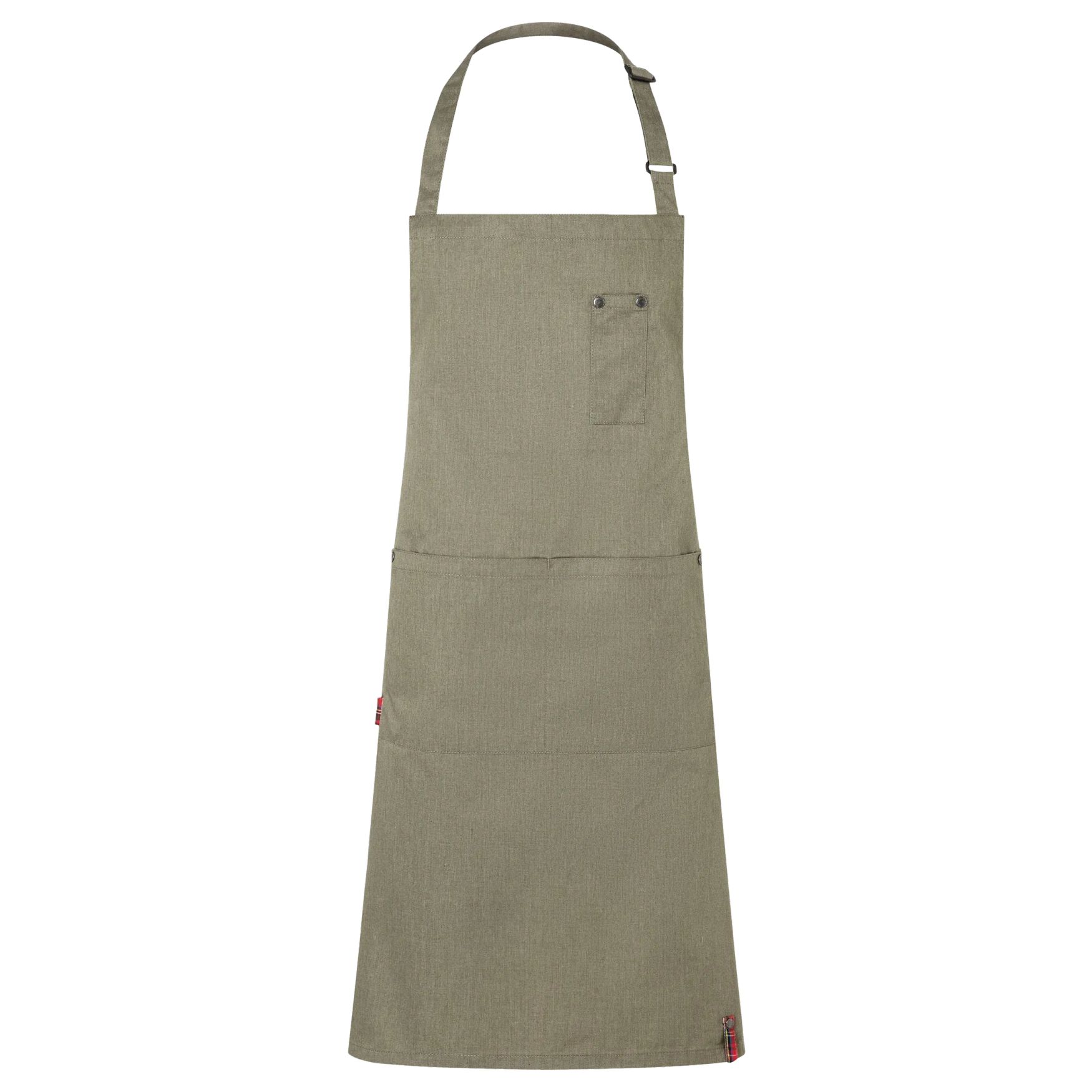 Le tablier à bavette denim-style est conçu en polyester recyclé et coton, combinant robustesse et confort. Il comporte deux grandes poches avant et une poche poitrine. La sangle est réglable grâce à une boucle pour un ajustement adapté.