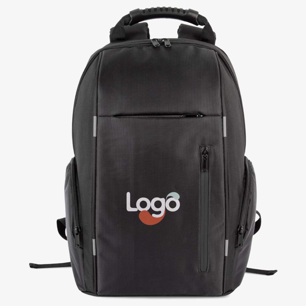 Sac à dos de travail avec matériaux contrastés. Grand compartiment principal pour les documents avec grande poche filet zippée. Compartiment pour ordinateur (jusqu'à 15 pouces) et tablette. Double poche frontale zippée. Deux poches latérales symétriques zippées. Bande adhésive au dos pour permettre de glisser le sac à dos dans les poignées d'un trolley et faciliter son transport. Dos et bretelles matelassés et respirants. Capacité : 21 litres. Composition : 100% polyester. Ce sac à dos offre une solution pratique et élégante pour transporter vos effets personnels et votre matériel professionnel. Il est possible de le personnaliser en broderie pour afficher votre logo ou votre identité visuelle.