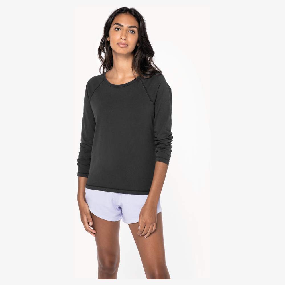T-shirt à manches longues raglan pour femme. Coupe ajustée, coutures latérales et aspect délavé. Encolure ronde avec colletage en bord côte 1 x 1. Finition en points de recouvrement sur les manches raglan, le bas des manches et du vêtement. Bande de propreté intérieure col en chevrons. Ce vêtement est teint après montage, ce qui peut entraîner des variations de couleur. Il peut également déteindre au contact de surfaces ou de vêtements clairs. Composition : 100% coton biologique. Possibilité de personnaliser ce t-shirt selon vos besoins.