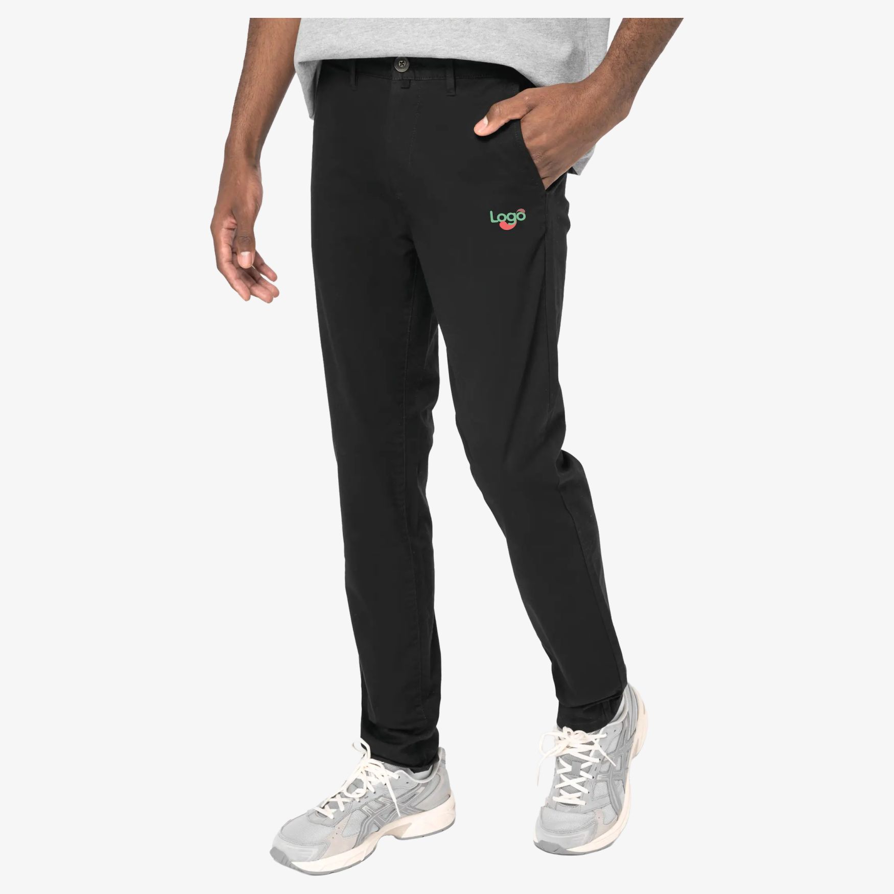 Le Pantalon Chino Homme 235g est un pantalon chino homme en twill, coupe slim, avec ceinture à passants, braguette à boutons et zip en métal. Poches avant, poche monnaie et poche arrière, avec détails imprimés à l\"intérieur des poches. Composition : 98% coton biologique, 2% élasthanne. Les couleurs peuvent varier selon les pièces.