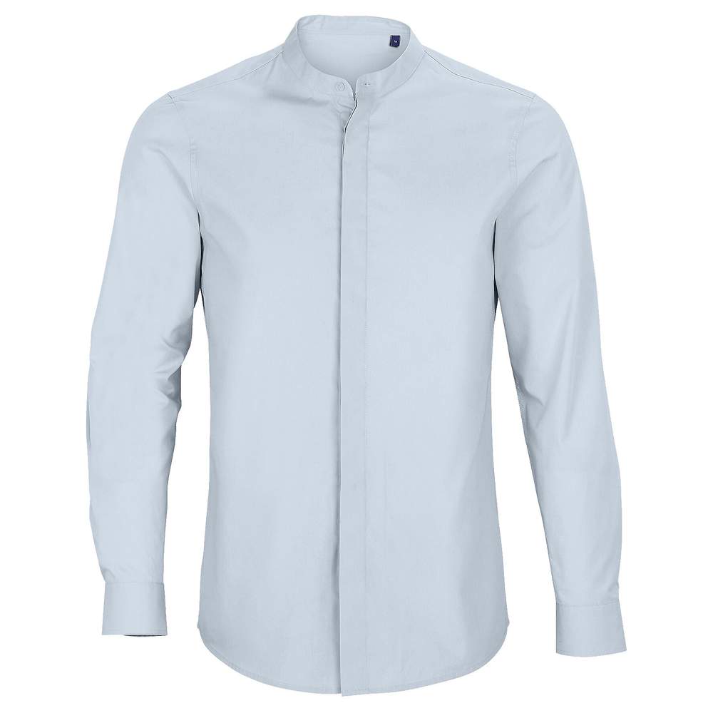 Chemise col Mao à manches longues pour homme. Elle s'adapte à différentes occasions pour ceux qui souhaitent un style distinctif. La popeline et la patte de boutonnage dissimulée contribuent à l'élégance de cette chemise conçue à partir de matières éco-responsables.