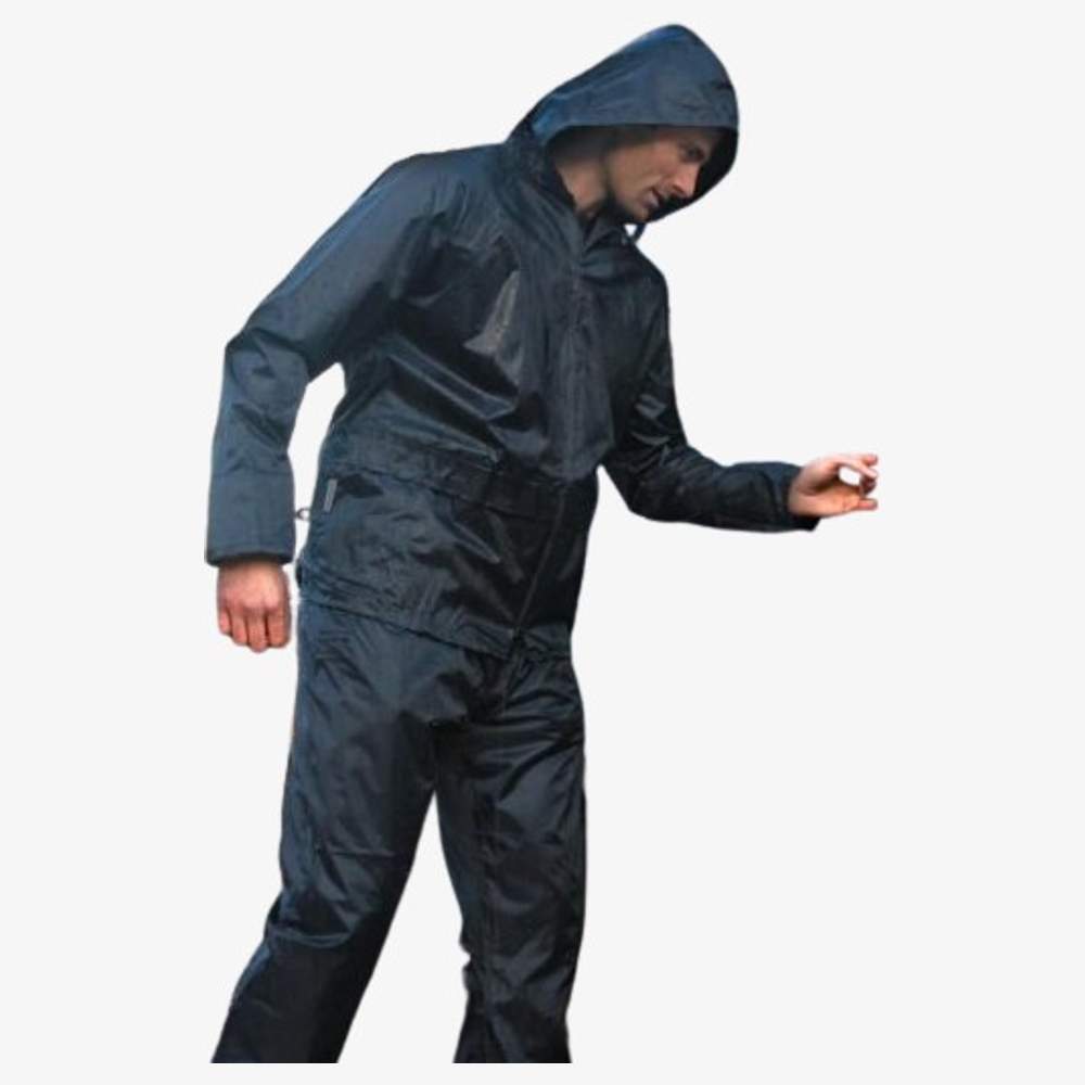 Cet ensemble est composé d'un pantalon et d'une veste imperméable, conçu en polyester 190T. La veste est dotée d'un grand zip à capuche avec cordon de serrage, ainsi que de deux poches pratiques. Elle intègre des poignets tempête intérieurs et un cordon de serrage à la taille pour un ajustement optimal. Le dos ventilé en maille favorise la circulation de l'air. Le pantalon est équipé d'une taille élastiquée et de deux poches, avec des chevilles à fermeture pression. L'ensemble est livré avec un sac de rangement à fermeture.