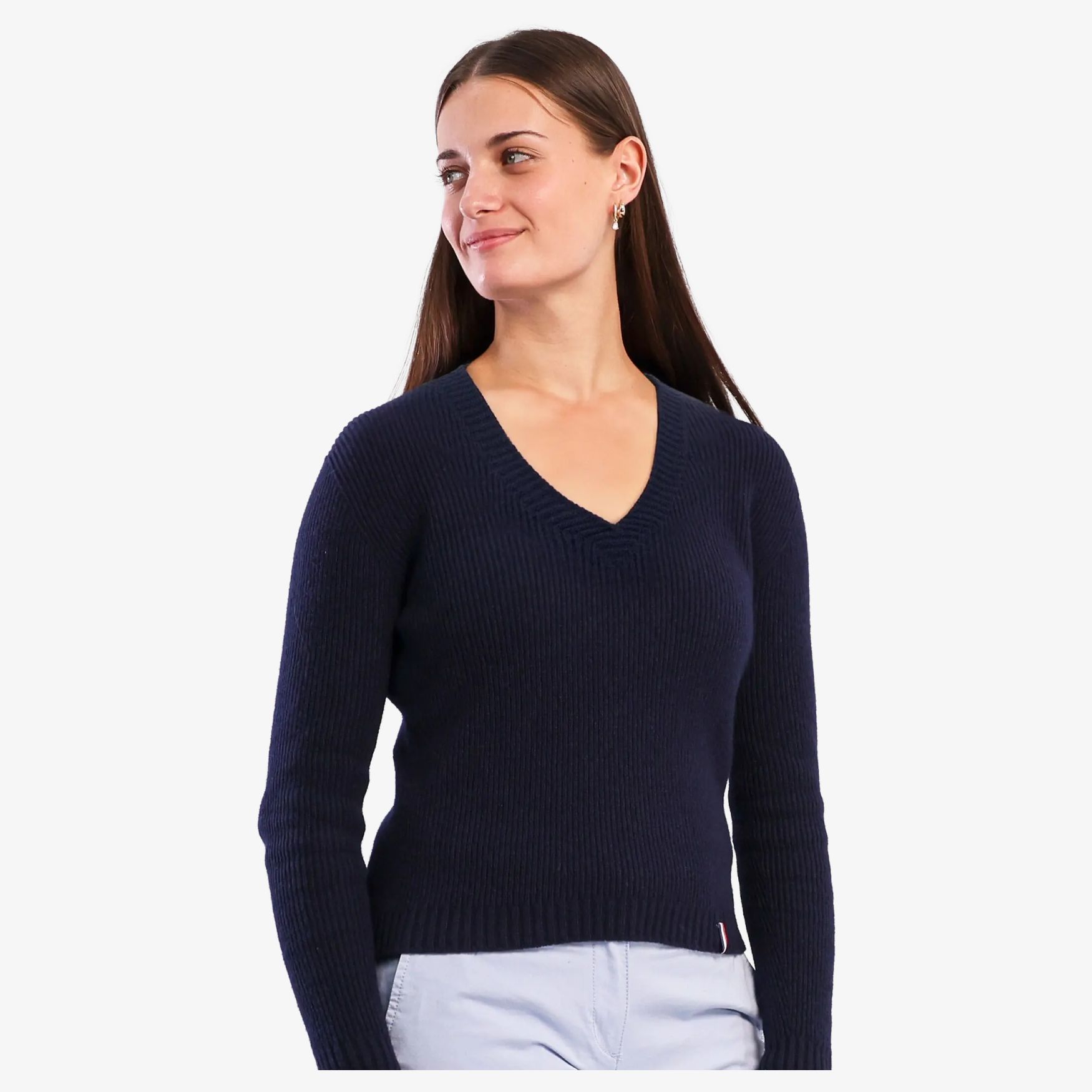 Le modèle Fanny est un pull col V pour femme en maille fine, confectionné à partir de laine mérinos extra fine. Sa conception allie confort et élégance pour s’adapter aux environnements professionnels comme aux moments plus décontractés. Le col V structure la silhouette facilitant l’association avec une chemise ou un simple haut léger.