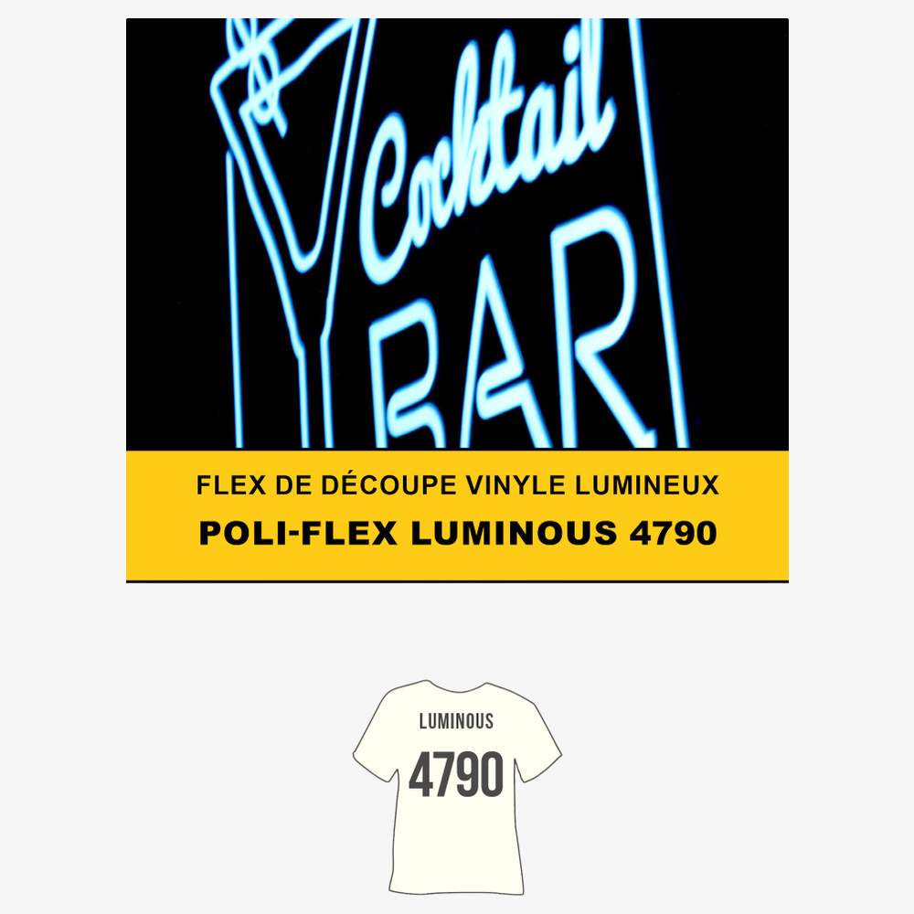 Flex de découpe à effet luminescent adhésif. Ce matériau permet de réaliser des marquages visibles dans l'obscurité sur différents supports textiles, techniques ou autres. Il est composé d'une colle polyuréthane et d'un film PET non adhésif. Le transfert s'effectue par thermocollage, en respectant les paramètres de température, de pression et de durée spécifiés.