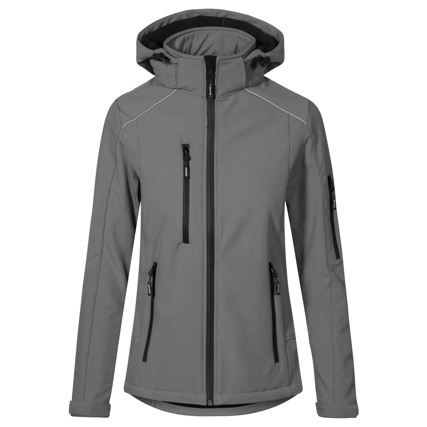 La Softshell Femme 7865 est une veste softshell pour femme adaptée aux usages extérieurs par temps variable. Elle comprend une capuche amovible avec réglage de volume, un protège-menton, des poignets ajustables, un cordon de serrage à la taille et un dos plus long à ourlet incurvé. Plusieurs poches zippées complètent l'ensemble, dont une poche poitrine type Napoléon, une poche manche et deux poches latérales.