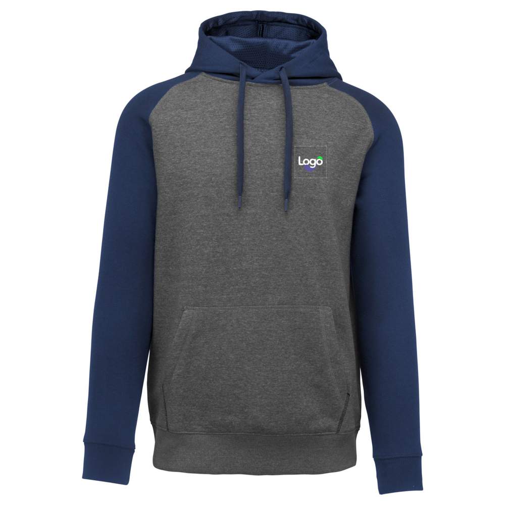 Sweat-shirt capuche bicolore adulte en molleton gratté 65% polyester / 35% coton. Manches raglan et capuche contrastées. Capuche doublée en maille filet ton sur ton. Poches kangourou avec poche téléphone fluorescente. Passe-fil écouteurs. Poignets et bas de vêtement en bord-côte double épaisseur 2 x 2. Ce sweat-shirt est personnalisable en broderie, permettant l'ajout de votre logo ou de vos éléments graphiques pour une communication efficace et personnalisée.