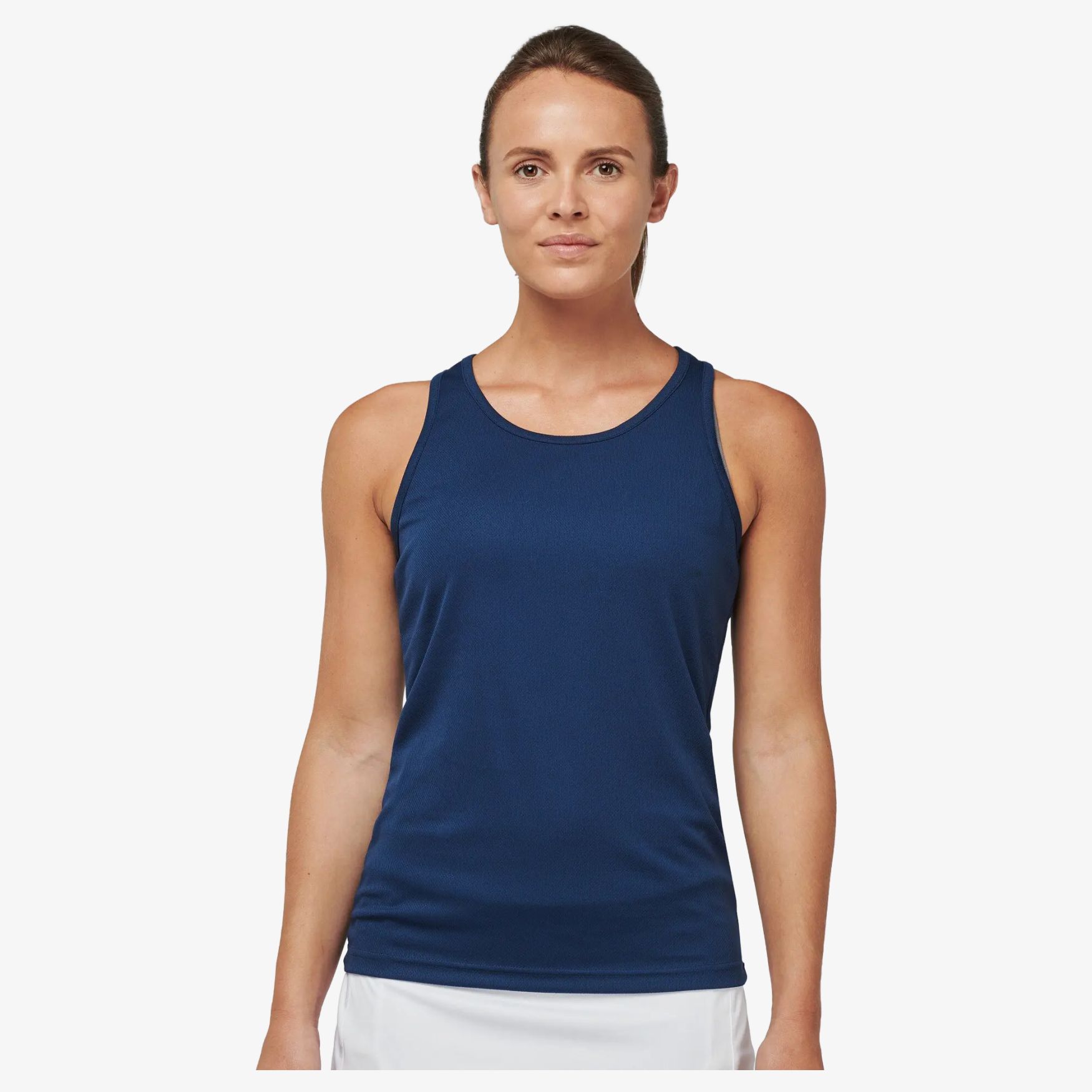 Ce débardeur sport femme est conçu en 100% polyester léger pour un confort optimal pendant vos entraînements. Son tissu à séchage rapide vous permet de rester au sec et à l'aise, même pendant les efforts intenses. La coupe dos nageur offre une grande liberté de mouvement, tandis que les biais à l'encolure et aux emmanchures assurent un ajustement confortable. La finition double aiguille au bas du vêtement garantit une durabilité accrue.
