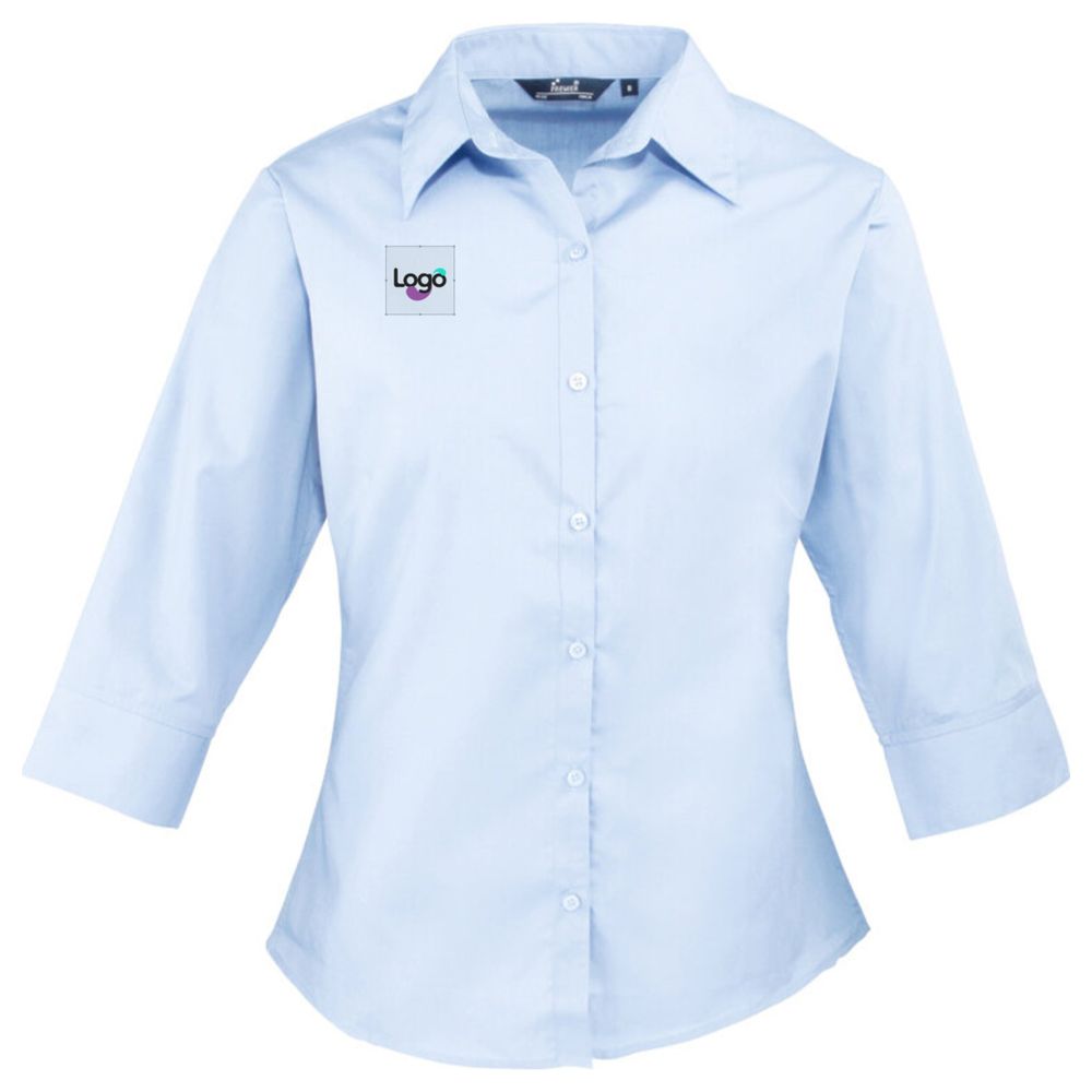 Chemisier popeline manches 3/4. Col non rigide. Bas arrondi. Coupe ajustée avec pinces au poignet et au dos. Entretien facile. Boutons nacre sur les chemises bleu clair et blanc. Boutons ton sur ton sur les chemises d'autres coloris. 65% Polyester, 35% Coton, popeline simple. Ce chemisier offre une base idéale pour exprimer votre identité visuelle grâce à la personnalisation en broderie. Ajoutez votre logo, un motif unique ou le nom de votre entreprise pour un look professionnel et distinctif.