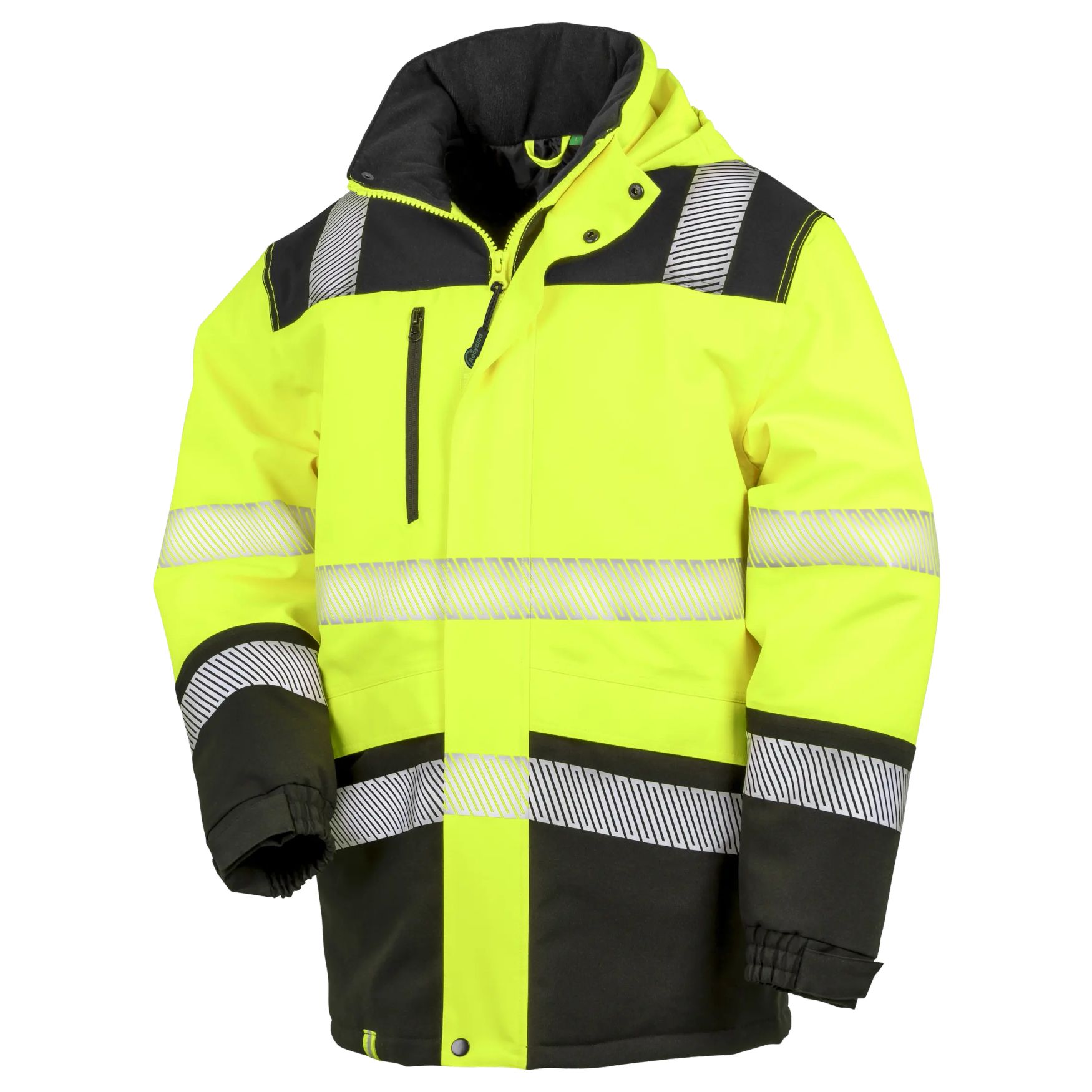 Le Safety Softshell coat est un manteau haute visibilité imperméable avec capuche escamotable, bandes réfléchissantes et doublure matelassée. La personnalisation par marquage est possible.