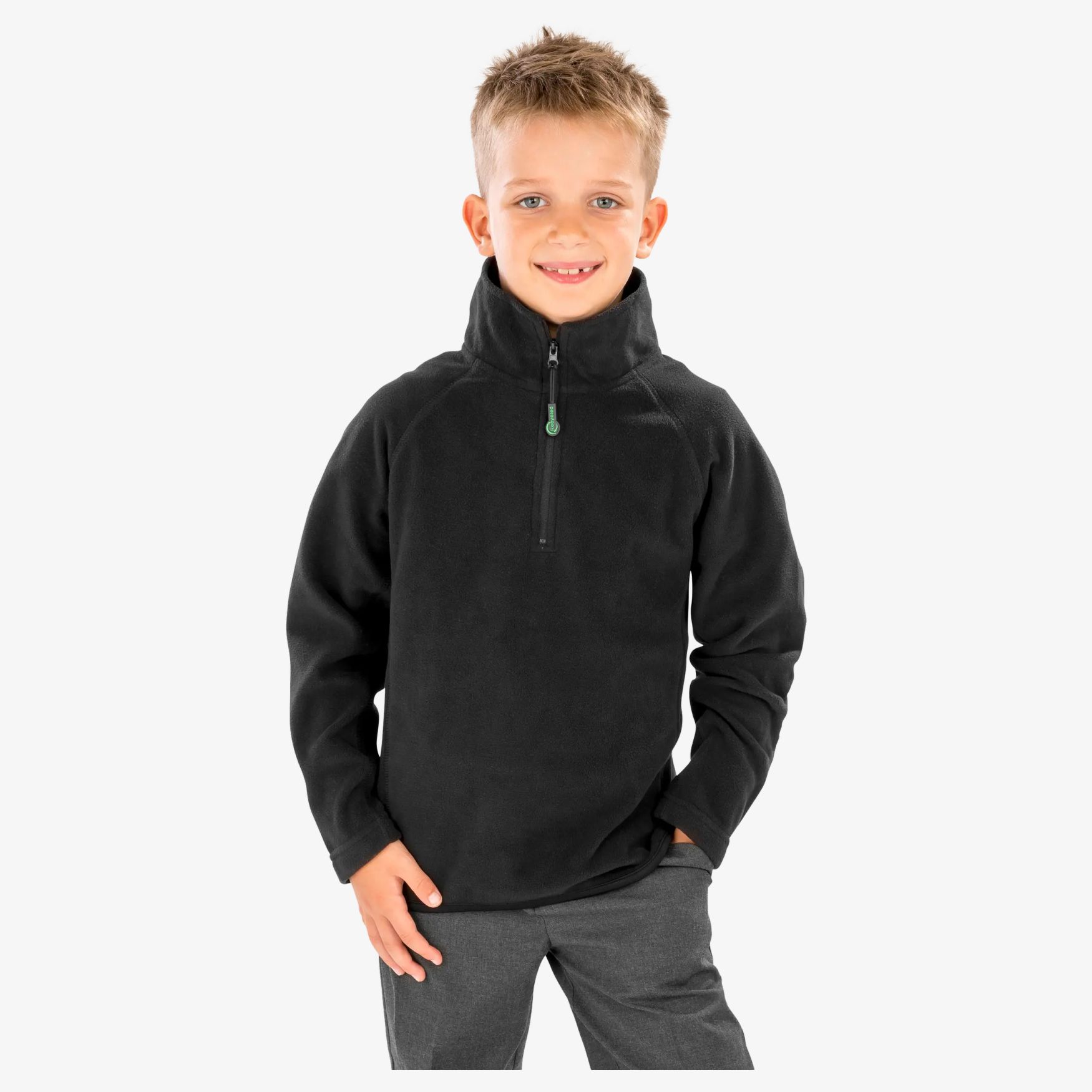 Le Junior Microfleece Recyclé est une polaire recyclée à fermeture zippée 1/4 à l'avant, avec poignets ouverts et taille aux bords gansés. Surpiqûre décorative sur le corps et patte de suspension.