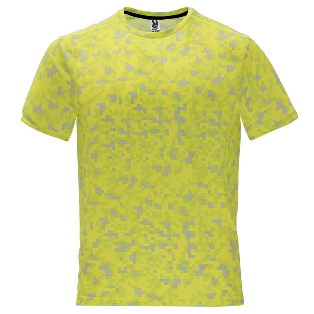 T-shirt technique à manches courtes avec motifs. Col rond avec bande de propreté renforcée et contrastée en couleur jaune fluo. Bandes latérales à l’intérieur de la manche et les épaules avec coutures ton sur ton. Modèle respirant. Étiquette détachable. Composition : 100% polyester, 140 g/m².